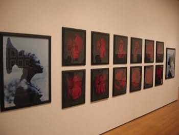 Carrie Mae Weems’s composite narrative “From Here I Saw What Happened and I Cried” (1995) is one of the strongest pieces anywhere on the floor. Composed from a series of found photographs that Weems has rephotographed, color toned, and onto which she has superimposed sand-blasted text, the images write out the unforgiving story of African Americans as photographic subjects for largely white photographers from throughout the medium’s history.