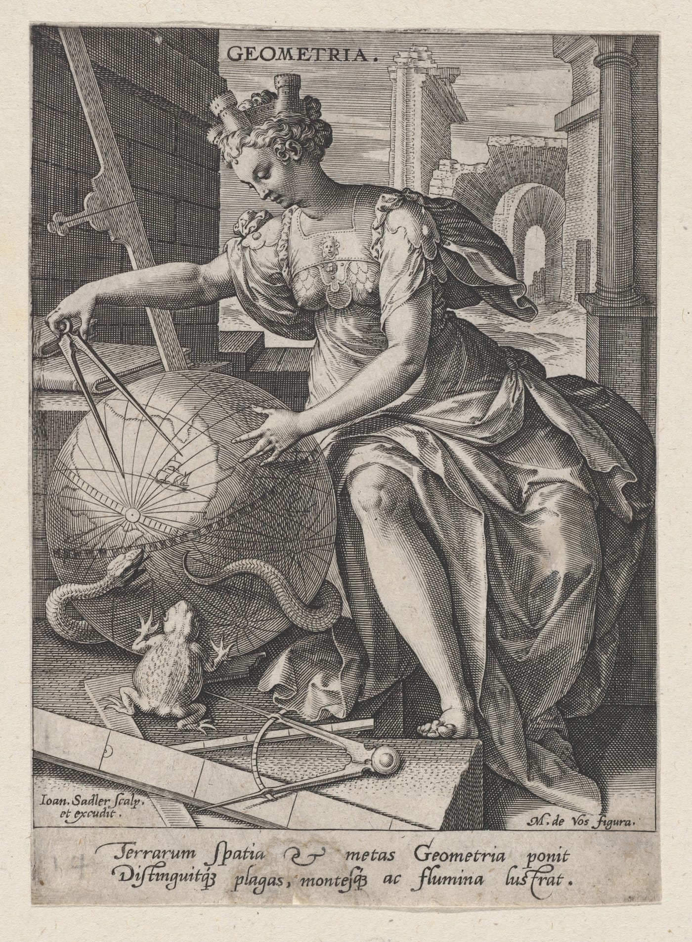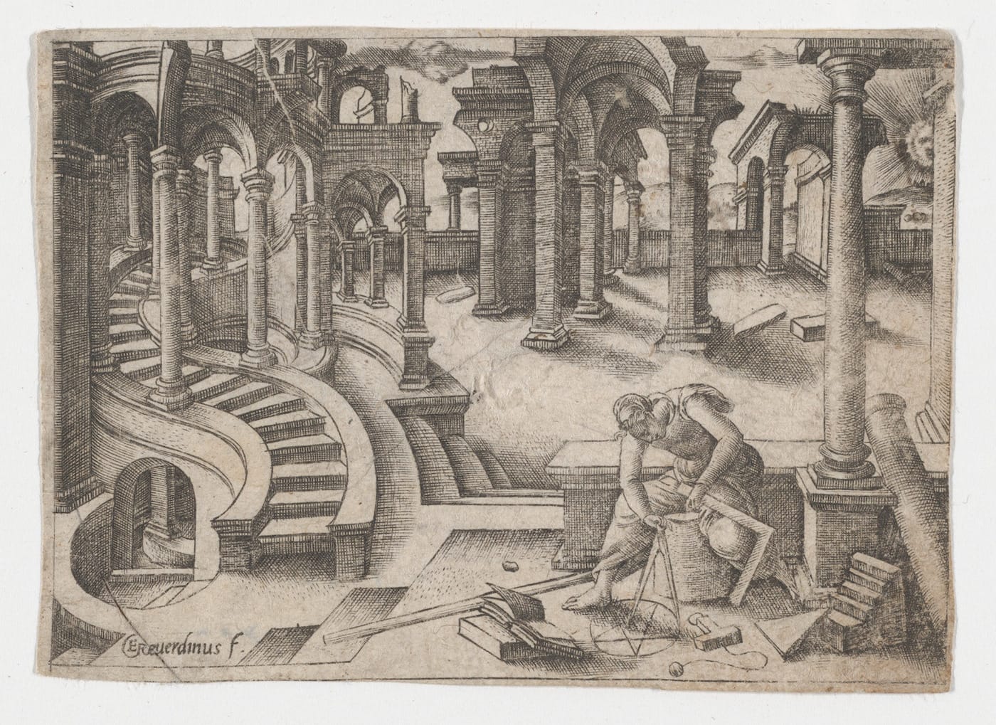 Alongside the Concinnitas prints are objects like a 1525 woodcut of a spiral by Albrecht Dürer, 1528 perspective drawings by Peter Flötner, and 19th-century gridded chalk studies by Victor-François-Eloi Biennourry. Often in these older works, math is allegorical rather than formulaic, its systems broadly used to convey the order and balance of the world. In Georges Reverdy’s 16th-century etching “The Architect,” geometry is portrayed as a woman creating a five-pointed star in a circle, while classical ruins stand behind her, all symbolic of math’s role in the process of architectural creation.