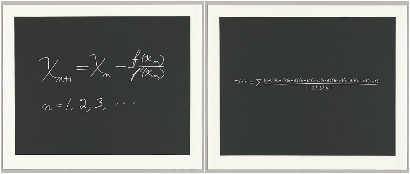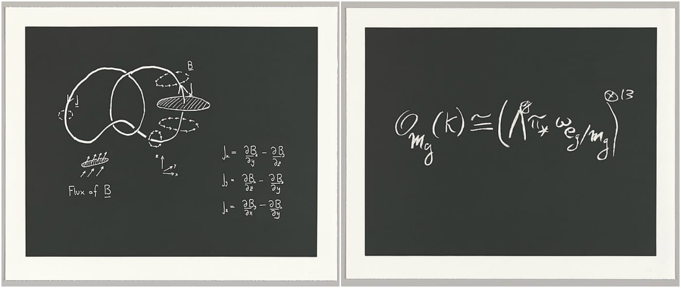 In 2015, the Metropolitan Museum of Art acquired a series of prints of the most beautiful equations, as drawn by 10 prominent mathematicians and scientists. Mathematician Stephen Smale, for example, chose the relatively simplified numerical analysis equation known as Newton’s Method, first published in the 17th century, while theoretical physicist Steven Weinberg’s demonstration of the Lagrangian of the Electroweak Theory, which contributed to his 1979 Nobel Prize, flows over four dense lines. The 10 prints of mathematical expressions known as the Concinnitas portfolio are the core of Picturing Math: Selections from the Department of Drawings and Prints, currently on view in the Met’s Robert Wood Johnson, Jr. Gallery.