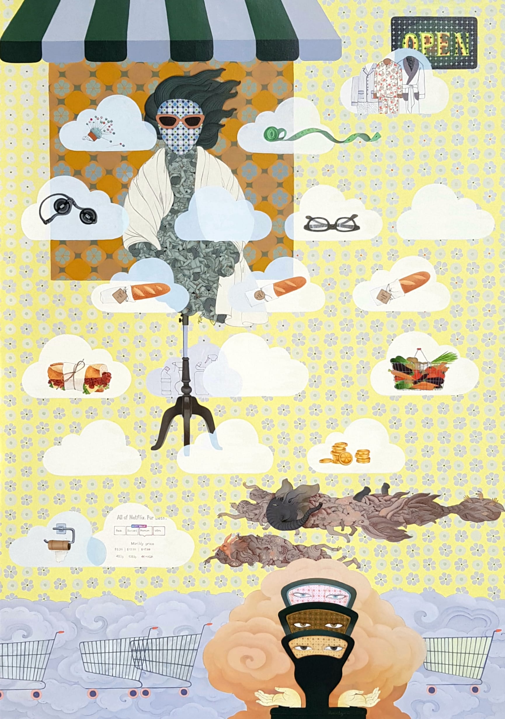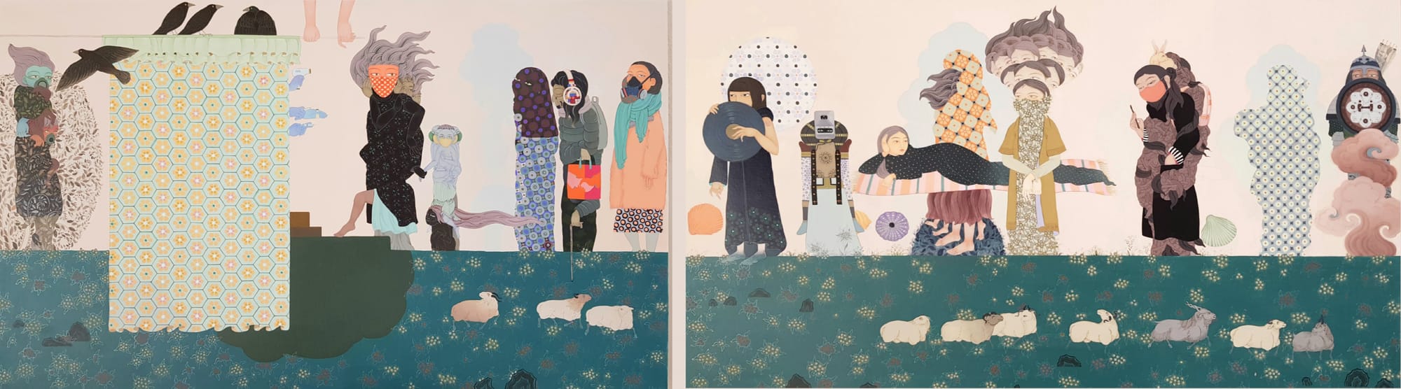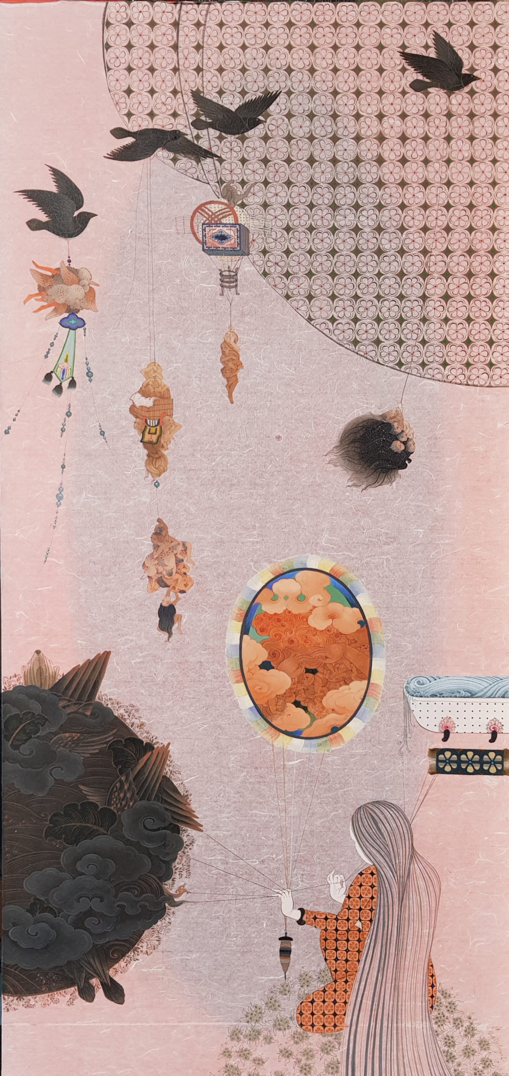 Dagvasambuu’s gallery calls her work a New Mongolian Zurag style, but that label only clarifies the art as pictorial and Mongolian. The artist’s fantastical visual vocabulary transcends the certainty of a historic title or the murky waters of national identity. In this latest series, she uses religious and secular iconography to give ethereal form to the trivial thoughts that flutter while passively scrolling online or worrying about the future.