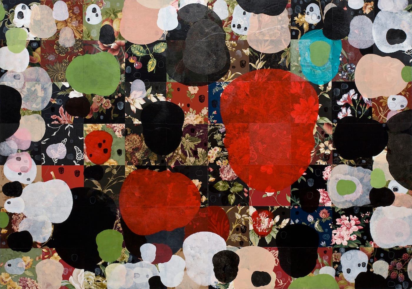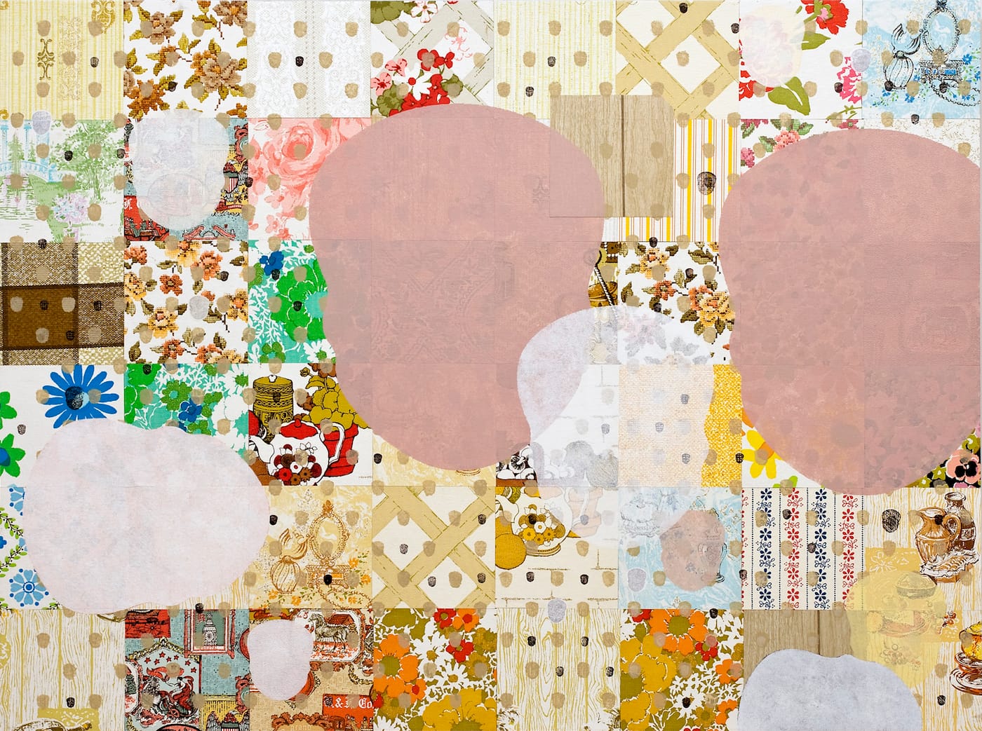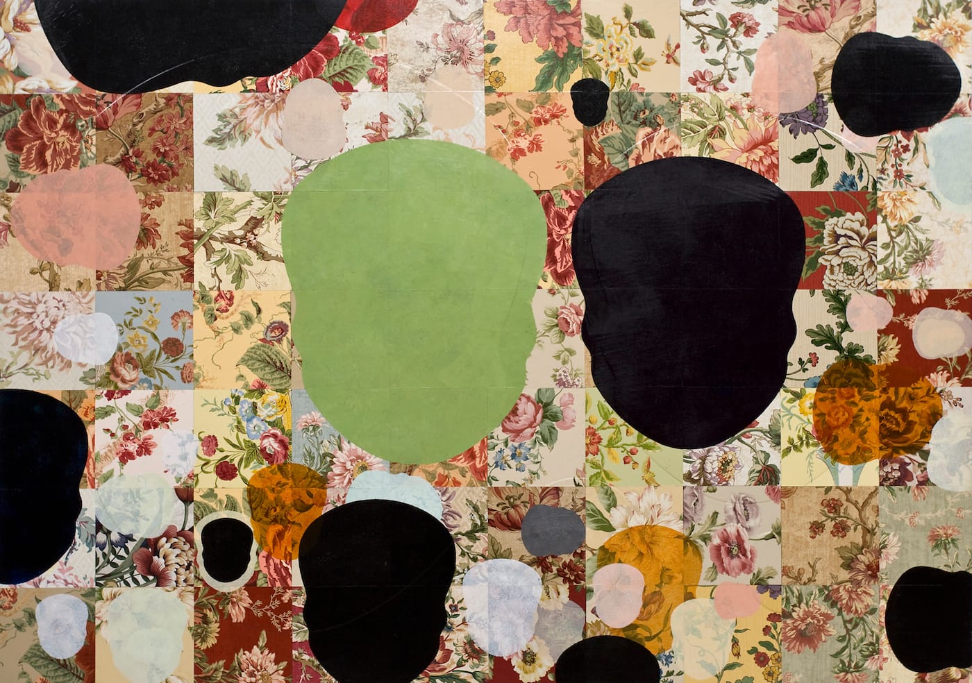 In “The Imaginary Other” (2007), the Black head is prominent, standing out against a backdrop of colonial wallpaper prints. There are other heads present as well, rendered in pastel pinks, oranges, and greens, but they almost blend into the wallpaper. The presence of the Black head actually distinguishes them: Without its sharp contrast, the other shapes would fade into nonexistence. In this sense, the imaginary Other is not an Other at all, but central to the composition’s balance.