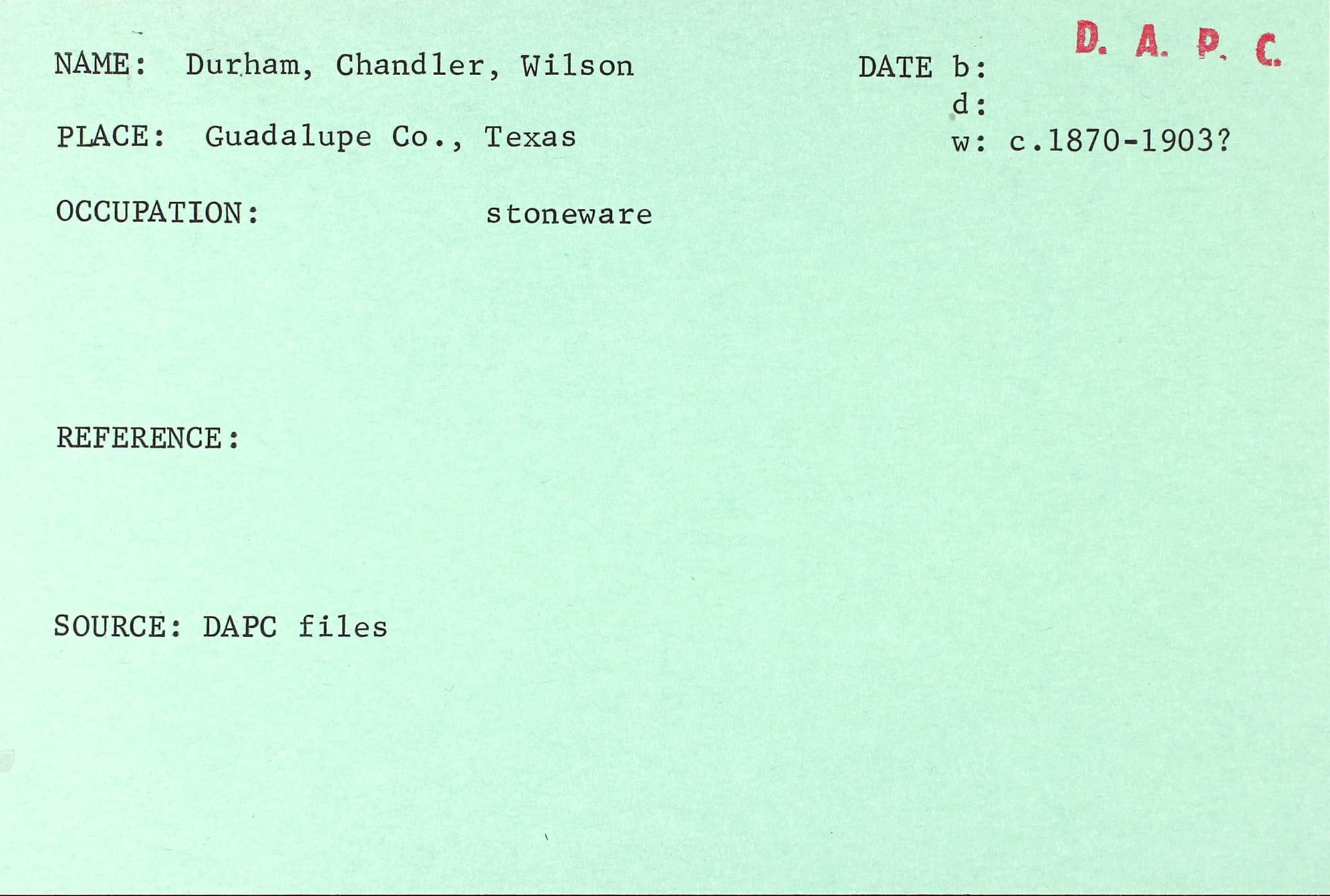I propose that the relationship between these three sites might stretch back further than folklore holds. What if Marion "MJ" Durham and John McKamie Wilson's families knew each other in Mecklenburg County, North Carolina? What if Durham was one of the primary investors in the Guadalupe Pottery with John McKamie Wilson? A partnership with Durham would support Wilson's decision to build a pottery company in Capote. As a member of the Durham potting dynasty in South Carolina, the former certainly possessed the knowledge and pottery production skills to ensure a sound investment.