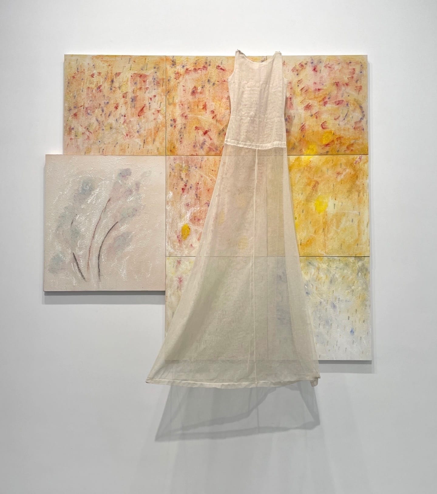Born in Bologna in 1943, Calzolari is one of the few living artists associated with Italy’s arte povera, a movement that sprung up in the 1960s to oppose a minimalist aesthetic coopted by capitalist, consumerist society. In addition to the arte povera artists’ preference for organic and homespun materials, their artworks often flirt with figuration, and specifically with the suggestion of the human form in Calzolari’s current work. Consider the works in the gallery’s intimate back room: disarmingly prosaic footprints waltz across a few small canvases hung salon style. Rendered in chartreuse, the shoe bewitches — a Cinderella with rash dreams of fluid identities. (A similar romantic adventure emanates from “Untitled,” 2019, in which a gauzy dress hovers atop a summery abstraction.) Calzolari’s grayish-brown version of the shoe, however, is closer to Van Gogh’s somber take: a peasant’s famously worn and weary pair, whose lyricism is scrappy and earthbound.