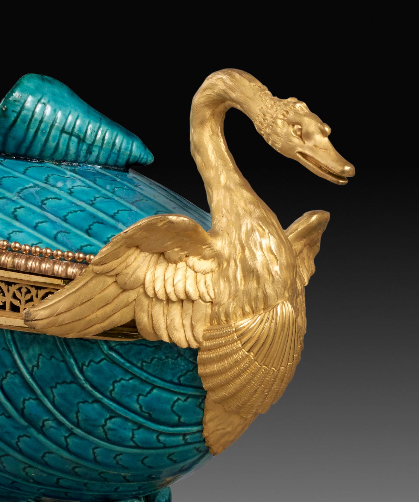 A significant aspect of Gouthière’s gilt bronze work is that it wasn’t gold molding, but intended to give the appearance of that purity, which the artist was so skilled at suggesting in his scaly details of serpents writhing above Chinese garden seats repurposed as vases in 1782, or the chased stippling of feathers on two swans on a pair of 1770s vases. Behind each of these objects were patrons convinced of their own right to this wealth, to convey it, no matter the authenticity of materials, down to their doorknobs, even while the mobs were growing outside their gleaming palaces.