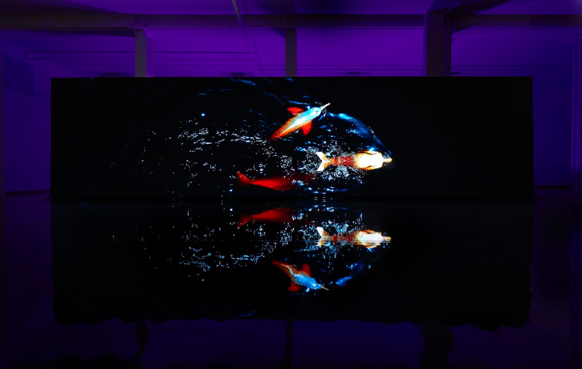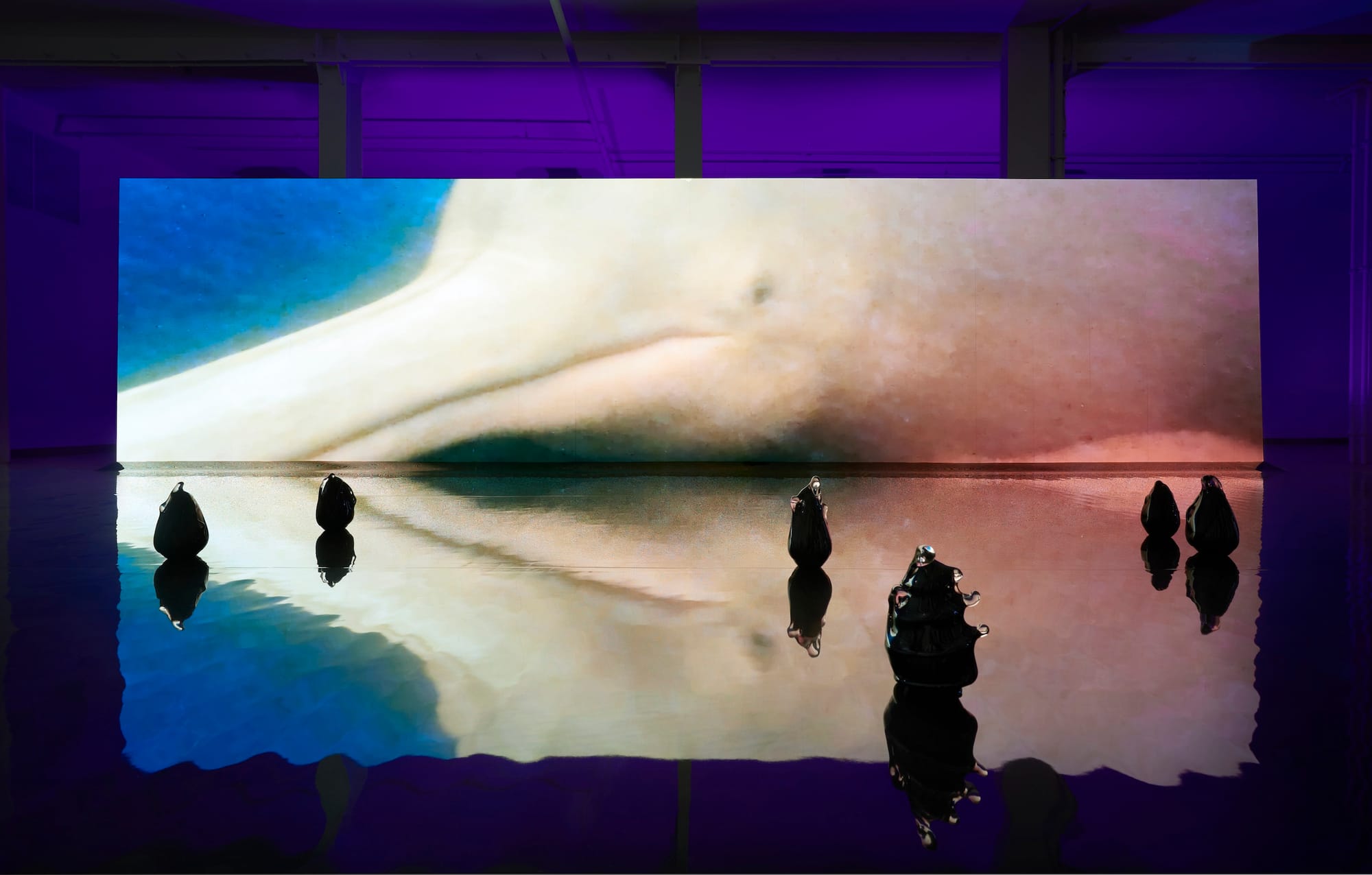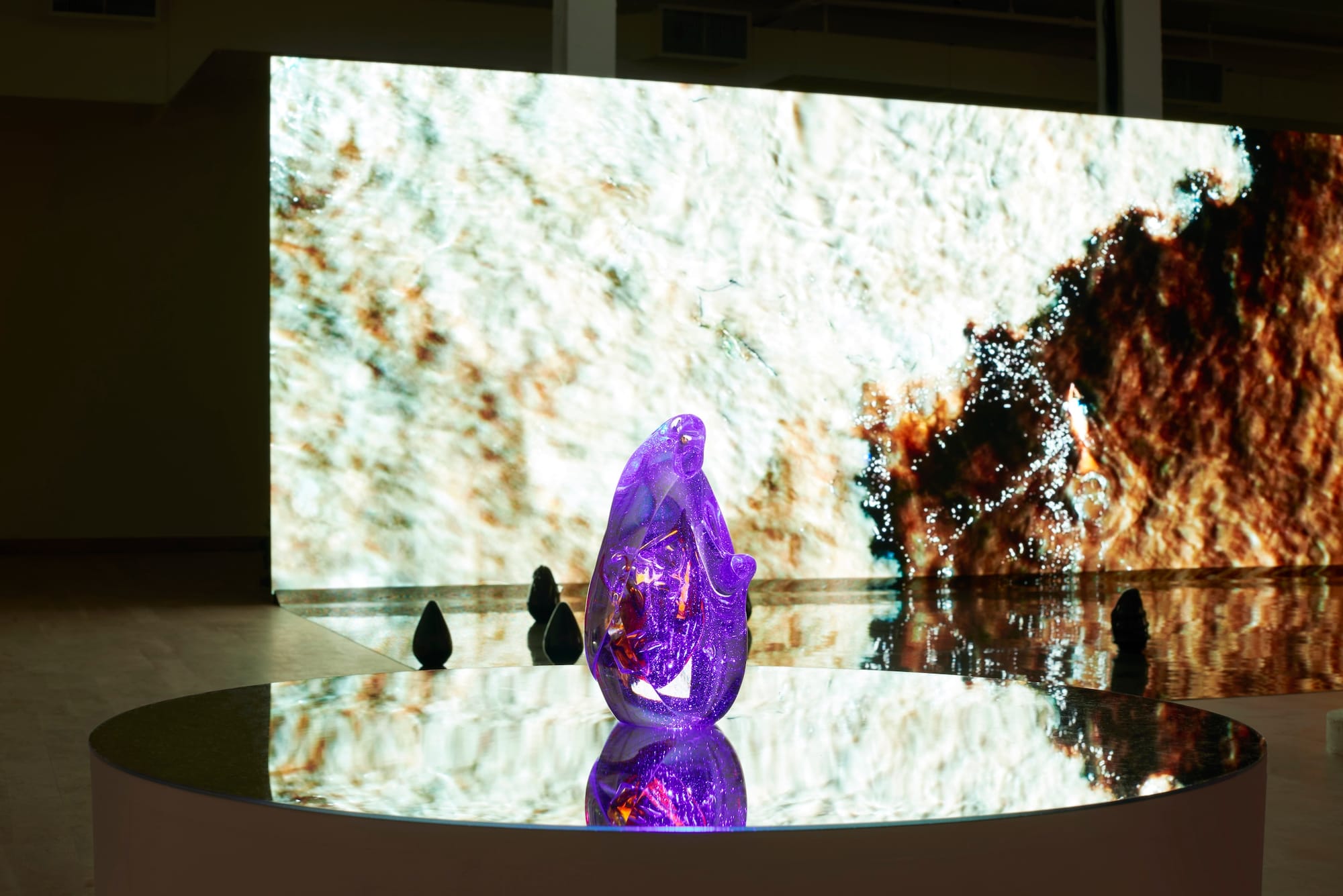 The video begins with a bird’s-eye view of the artist donning a fishtail and swimming in the black Rio Negro, lined with lush green trees. The camera zooms closer as one side of the water changes color to milky white, marking the convergence of the rivers. The mermaid swims along the border between the two, and eventually, pink dolphins emerge. Known locally as botos, the Amazon River dolphins are able to swim through both bodies of water due to their expert echolocation abilities. The artist swims among them with a camera attached to her body, offering close shots of the dolphins as they navigate the rivers with beauty and ease. Accompanying exhibition text notes that just a year after completing the film, droughts led to mass deaths for the species, a sobering reminder of the repercussions of deforestation and climate change. A reflective sheet on the floor in front of the film adds an immersive element to the installation, on top of which the artist has added small glass sculptures intended to represent mermaid tears, though the inclusion of the latter wasn’t particularly impactful.