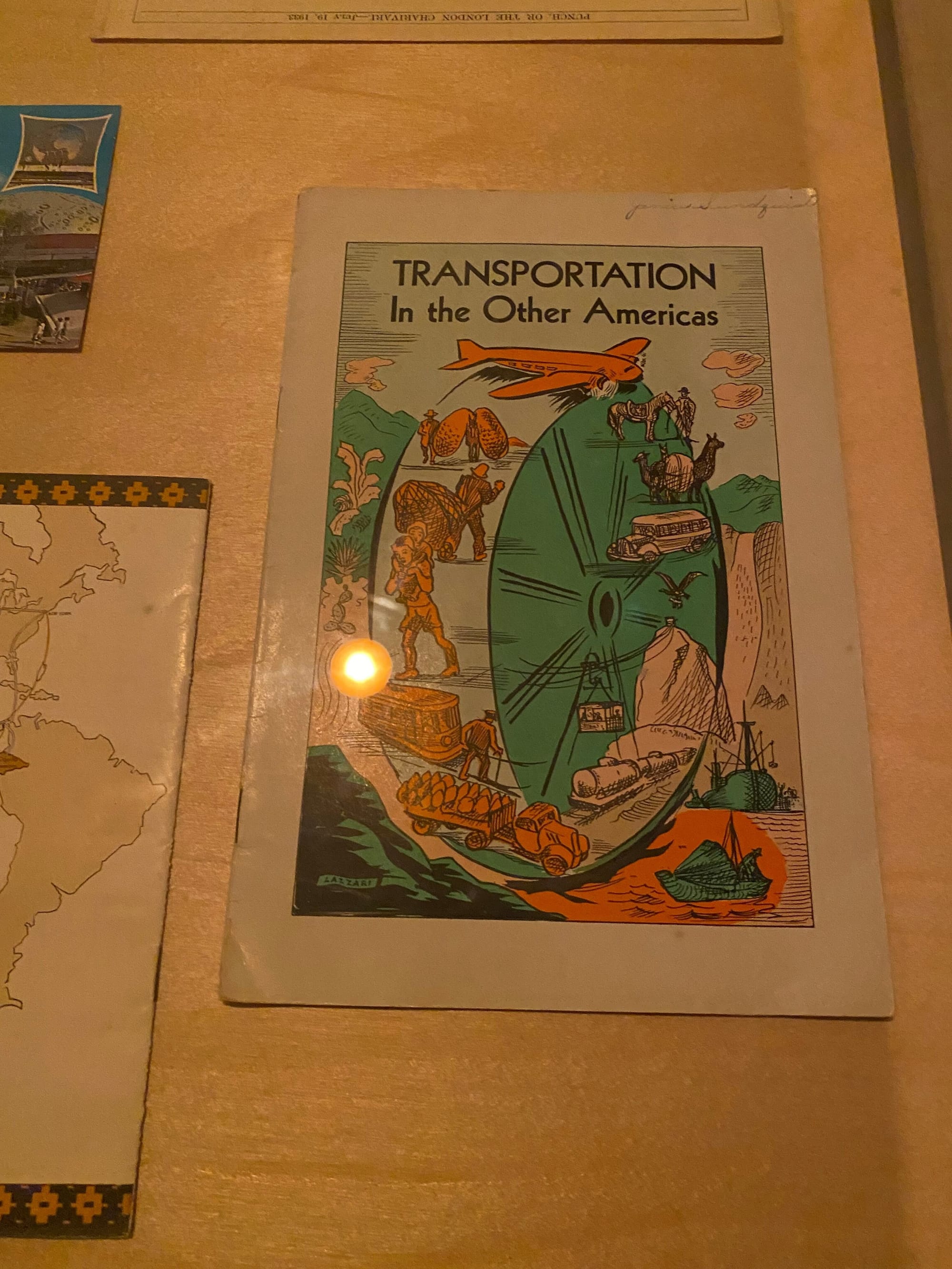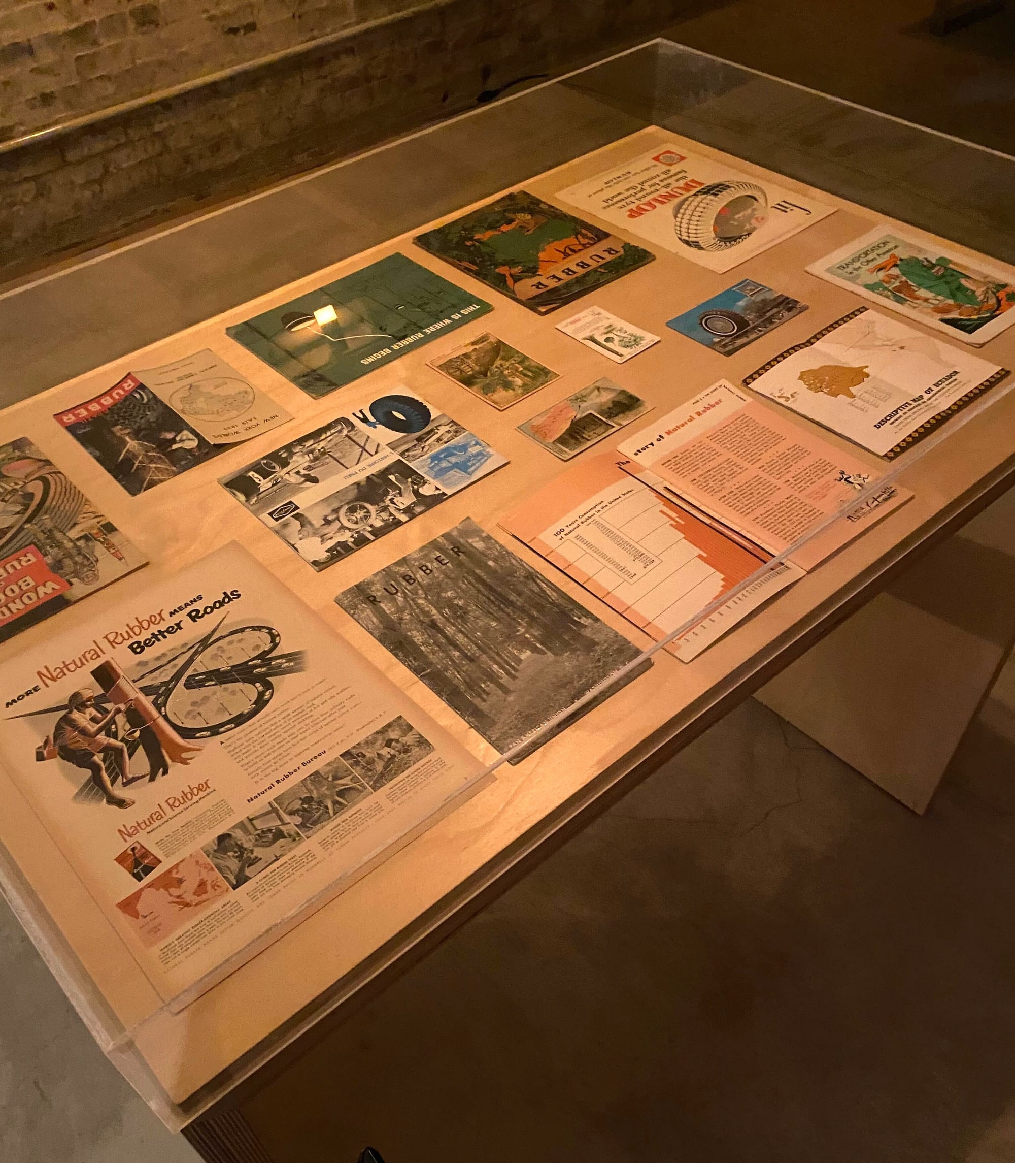 Downstairs, Adrián Balseca’s complementary exhibition Routing Rubber encompasses black-and-white film and archival ephemera to provide historical context for the legacy of extraction that threatens Amazonian ecosystems like that of the botos. Focusing on the rubber industry that boomed in the Amazon between 1879 and 1912, Balseca illuminates the historical rhetoric that fostered ecological destruction. Archival advertisements from companies including Goodyear and the Dunlop Company Limited tell a narrative of rubber as a key resource across industries, suggesting that the material ushered in aspects of modernity, with one BFGoodrich ad from 1965 illustrating a tire next to an astronaut. Gloves hang along the wall of the gallery, another innovation made possible with rubber.
