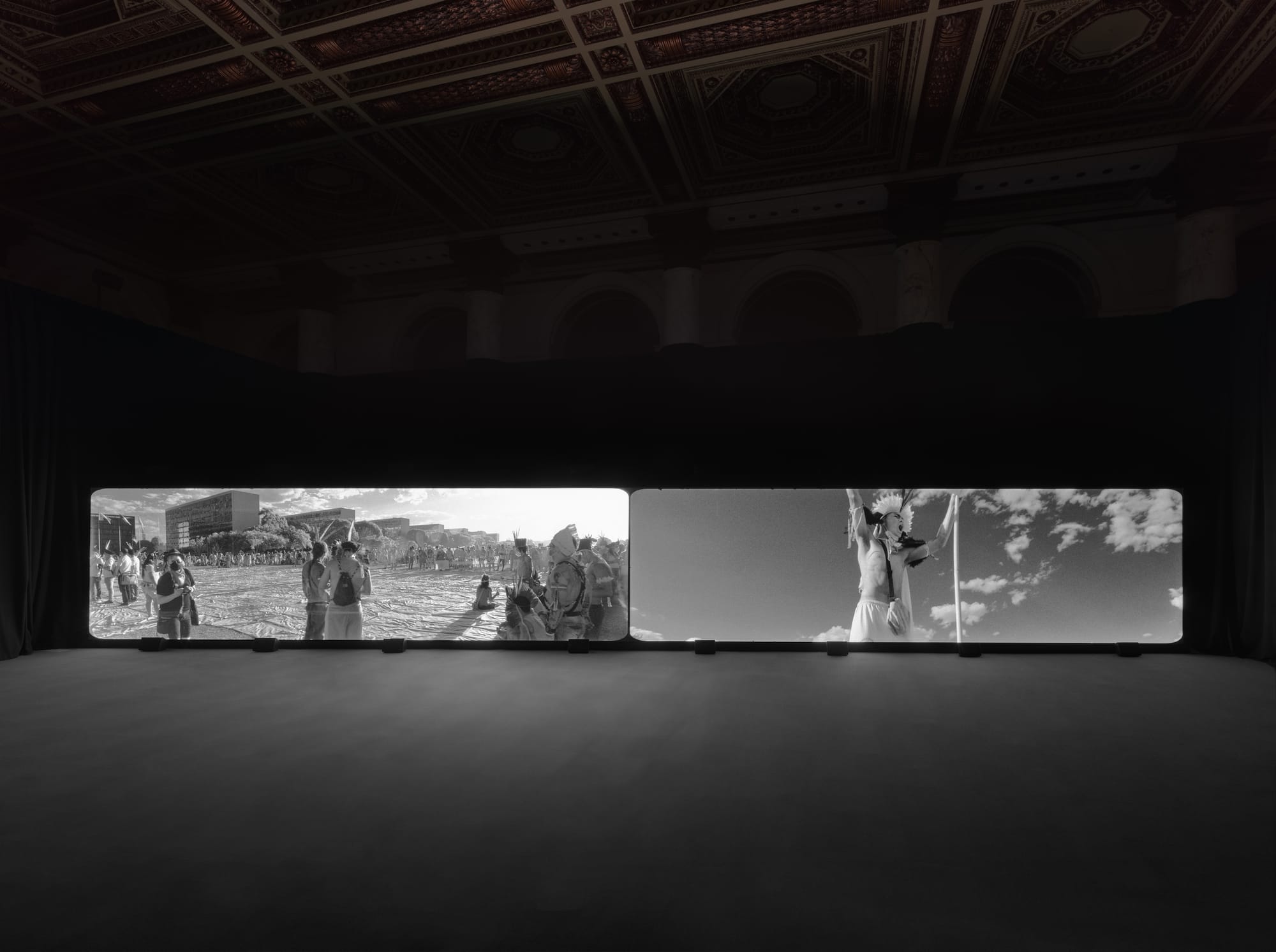 At Jack Shainman Gallery, Richard Mosse’s video installation, Broken Spectre, unites themes of environmental exploitation raised by Balseca and Škarnulytė. Filmed between 2018 and 2022 across the Amazon Basin region, the immersive video showcases shocking footage of systematic deforestation that has decimated the environment over the last 50 years. In prolonged clips of cattle being herded and slaughtered, their sinewy bodies are violently dissected by men wearing minimal protection as blood and guts splatter near their eyes and mouths. Mosse also highlights the dangerous deforestation process required for the meat and mining industries, with equally ill-equipped men cutting down and burning monumental trees.