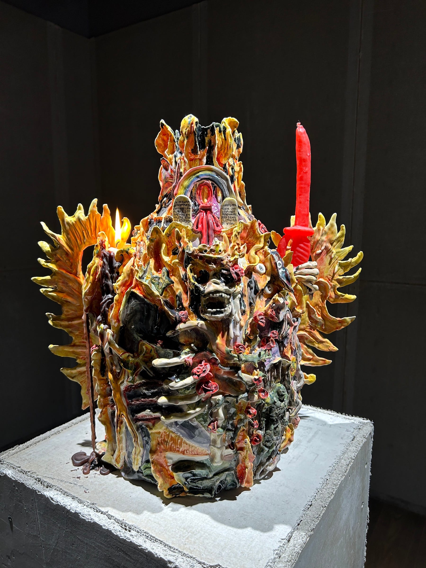 Multicolored ceramic sculptures, concrete pillars reminiscent of skyscrapers featuring comic book superheroes, children’s cartoons, eroticized manga characters, and ancient Maya symbols mashed together comprise ¿Quién no ha intentado convertir una piedra en un recuerdo? — a new exhibition at Pioneer Works by Guadalajara-based artist Alejandro García Contreras grappling with subconscious memories, inherited beliefs and myths, and capitalistic consumerism.
