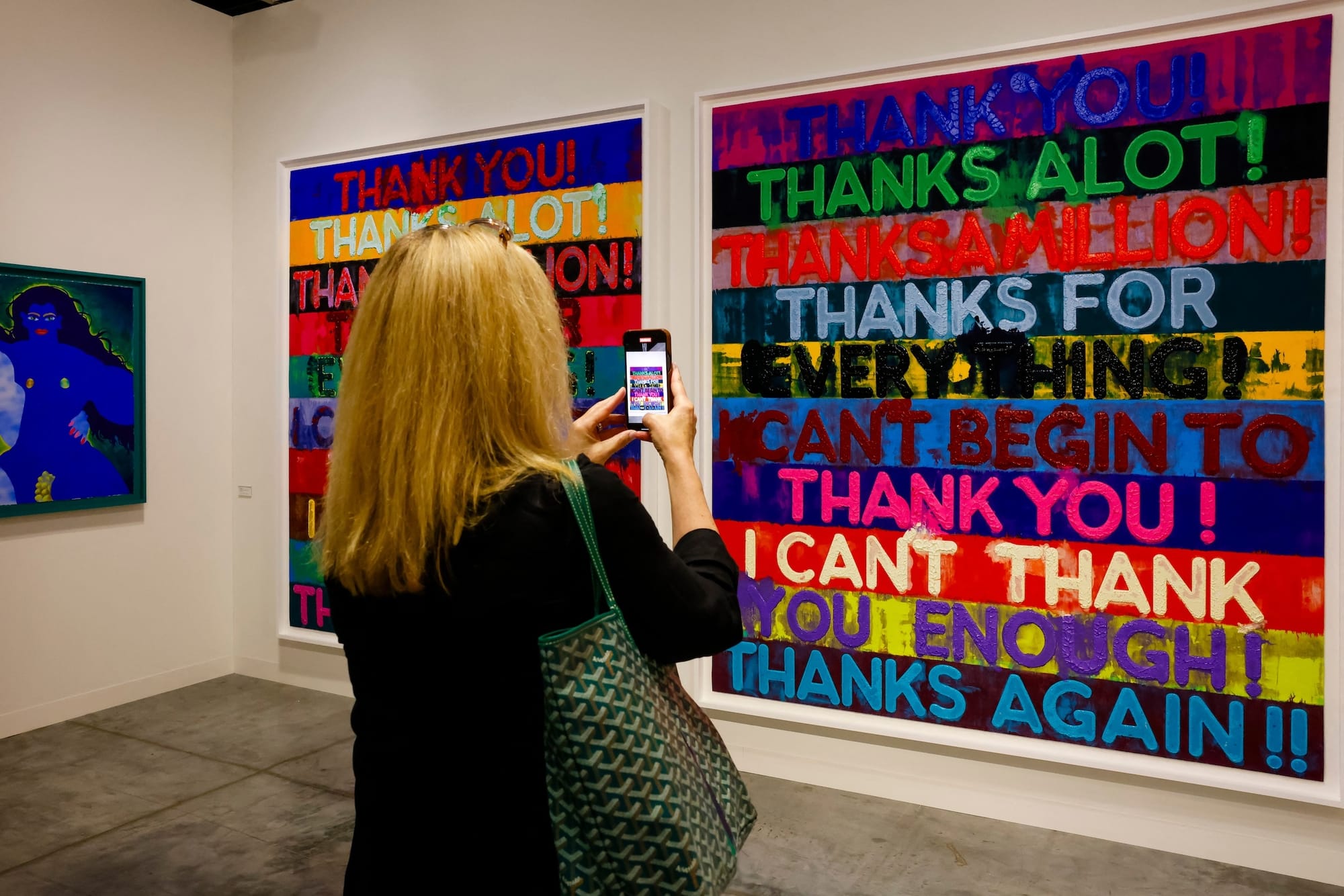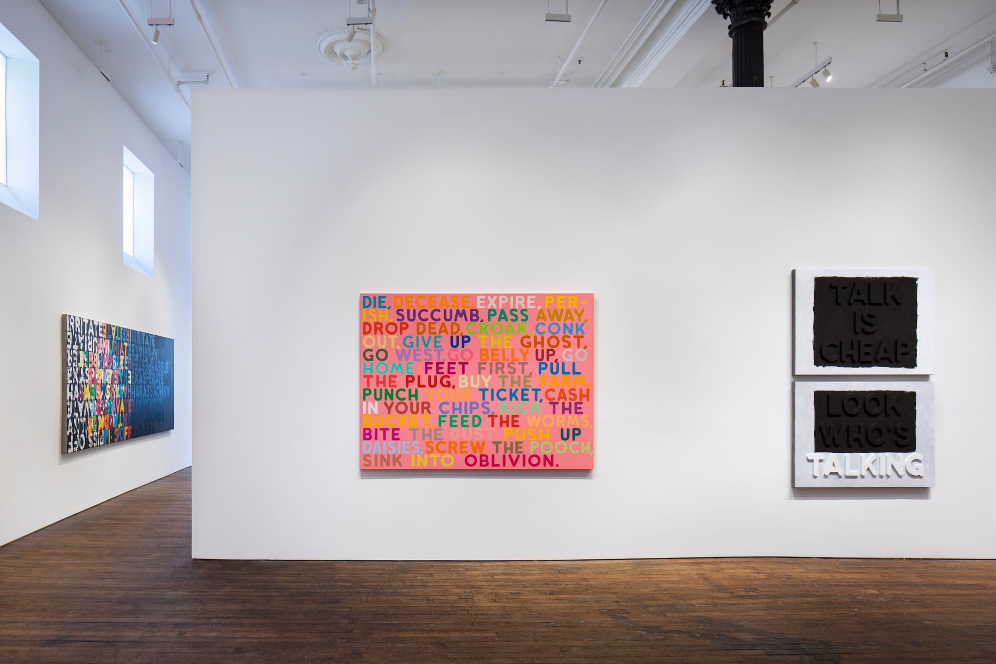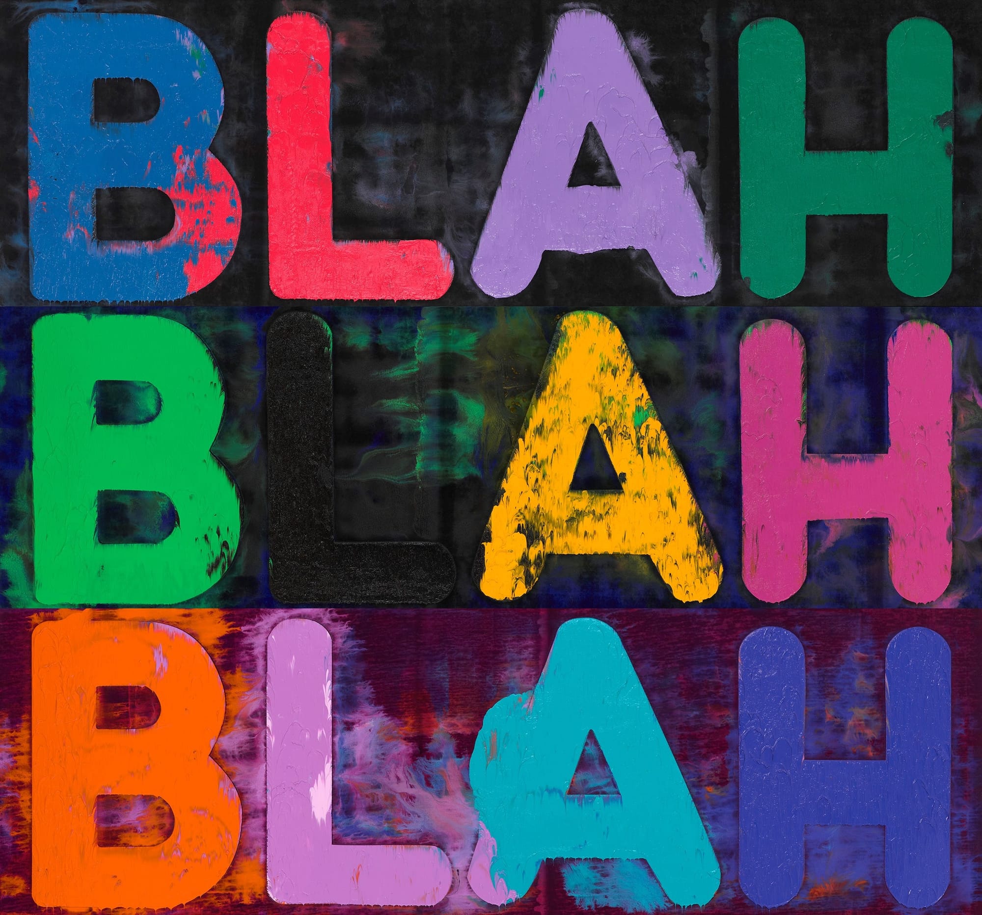 Bochner is best known for his vibrantly colored, sans serif "thesaurus paintings" that fixate on a word and its stream of synonyms — each with their own individual meaning and variation from the origin — connoting language's simultaneous freedom and instability. In the late aughts, he turned away from representing the complexity of language through expansive word webs and began his iconic "Blah! Blah! Blah!" paintings, telling FAD Magazine in 2020 that the supposedly senseless chatter is "a way of shorthanding a conversation."