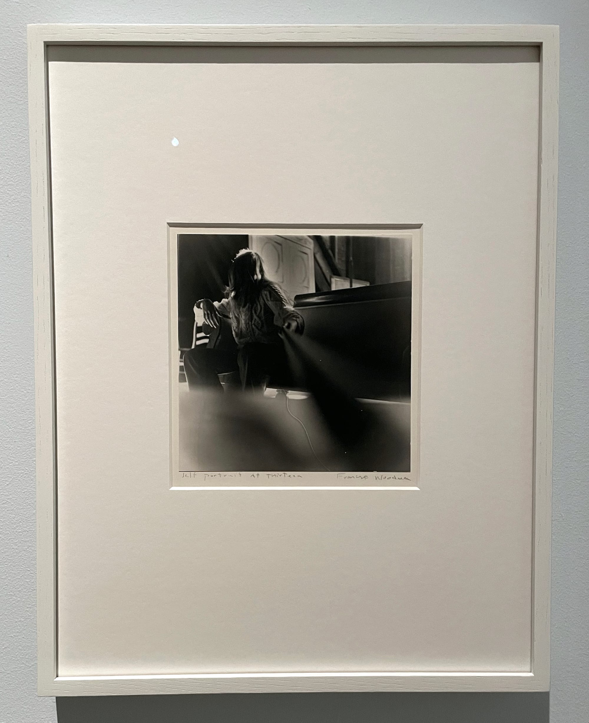 The show begins with the photograph that each artist considered her first successful image. Both works contain many of the qualities that came to define their aesthetics. In Cameron’s “Annie, My First Success” (1864), contrasting dark and light areas divide the picture plane into clear zones that frame the nine-year-old subject’s three-quarter profile, gently encircling Annie’s face and hair to establish her as the focus and suggest an interior life. Woodman’s “Self-portrait at Thirteen” (c. 1972) obscures any sense of interior life by covering her face with her hair. Diffuse light from an unseen source absorbs her body into a mosaic of grays, her legs dissolving into the haze that overtakes the lower part of the image. In these pieces, Cameron uses composition and light effects to create a narrative work that centers and romanticizes the sitter, while Woodman employs the human body as a formal element in explorations of light and composition.