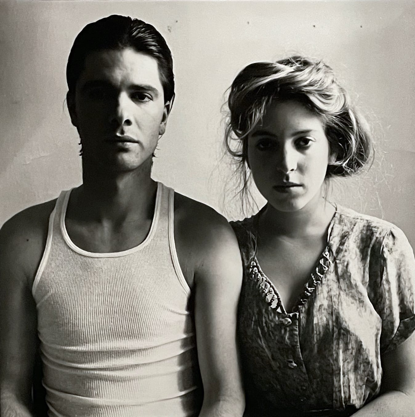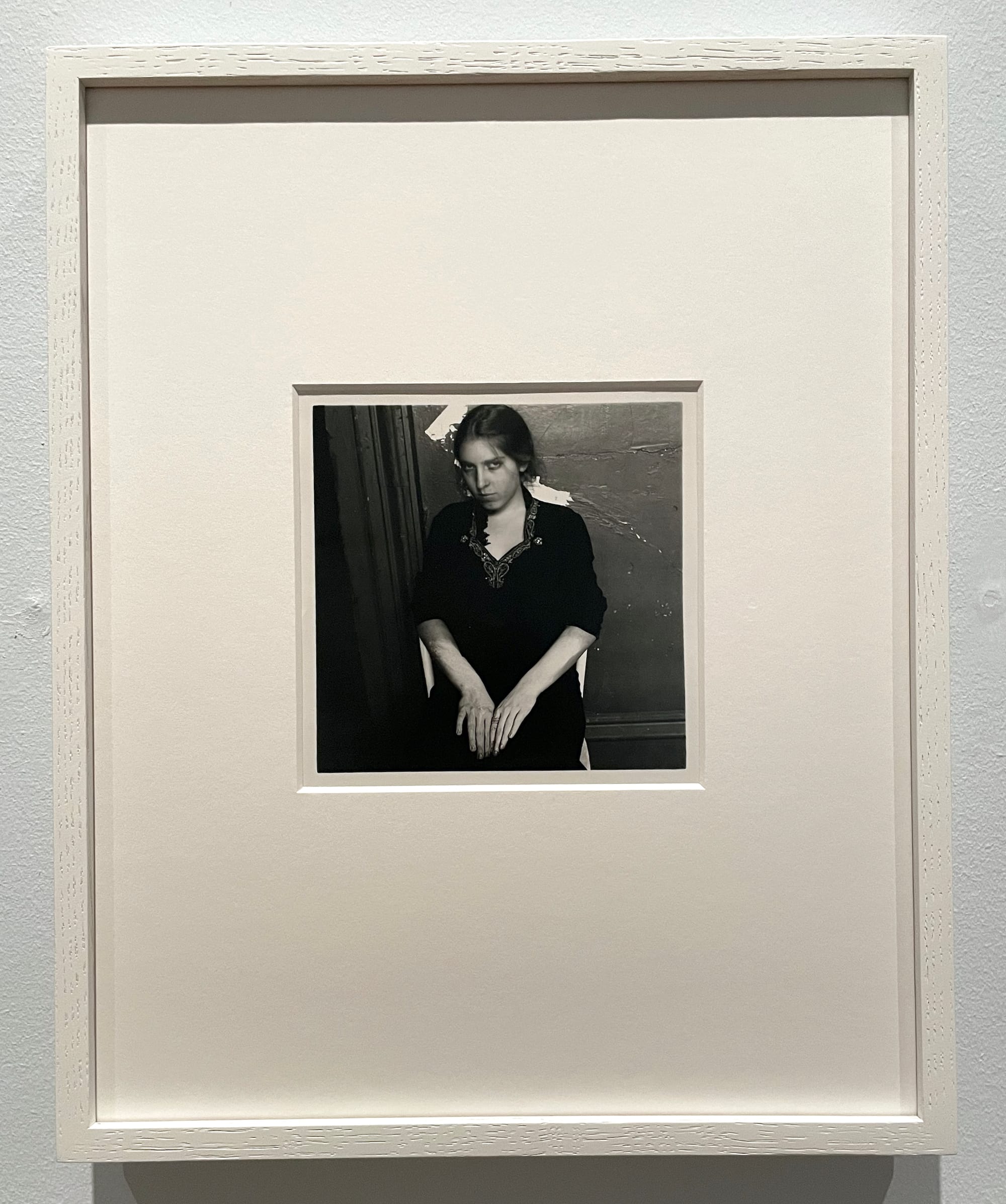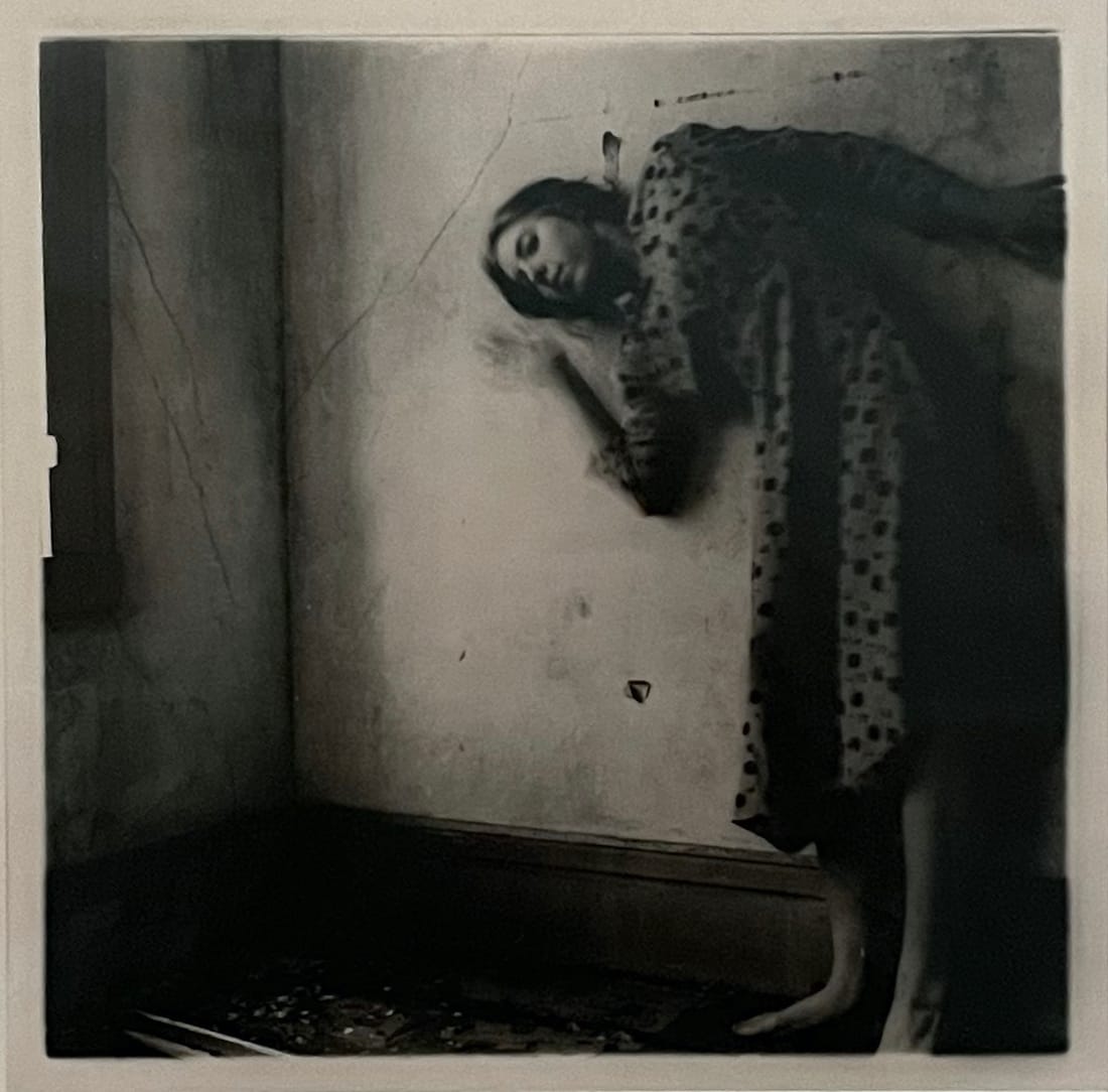 Woodman’s most “portraity” portraits are of her boyfriend, Benjamin Moore, in the section Models and Muses. A 1976 photo is a stark close-up of the subject’s face, his gaze nearly piercing the camera, while an untitled work from c. 1977–78 and “These People Live in That Door” (c. 1976–77) pair Benjamin and Francesca. In the former, the two sit together in the tight space of the frame, Benjamin’s masculinity emphasized by his white undershirt, slicked back hair, and shadows engulfing the right side of his face; Francesca is defined by her smaller stature, softer gaze, and the wispy upsweep of her hair. In the latter, Benjamin, in a black leather jacket, leans in toward the camera and Francesca, in a girlish dress, shrinks back against the wall in a passive stance, exaggerating their size and height differences. Here, Woodman creates an image of traditional heteronormative domesticity, in which the man presides over the woman.