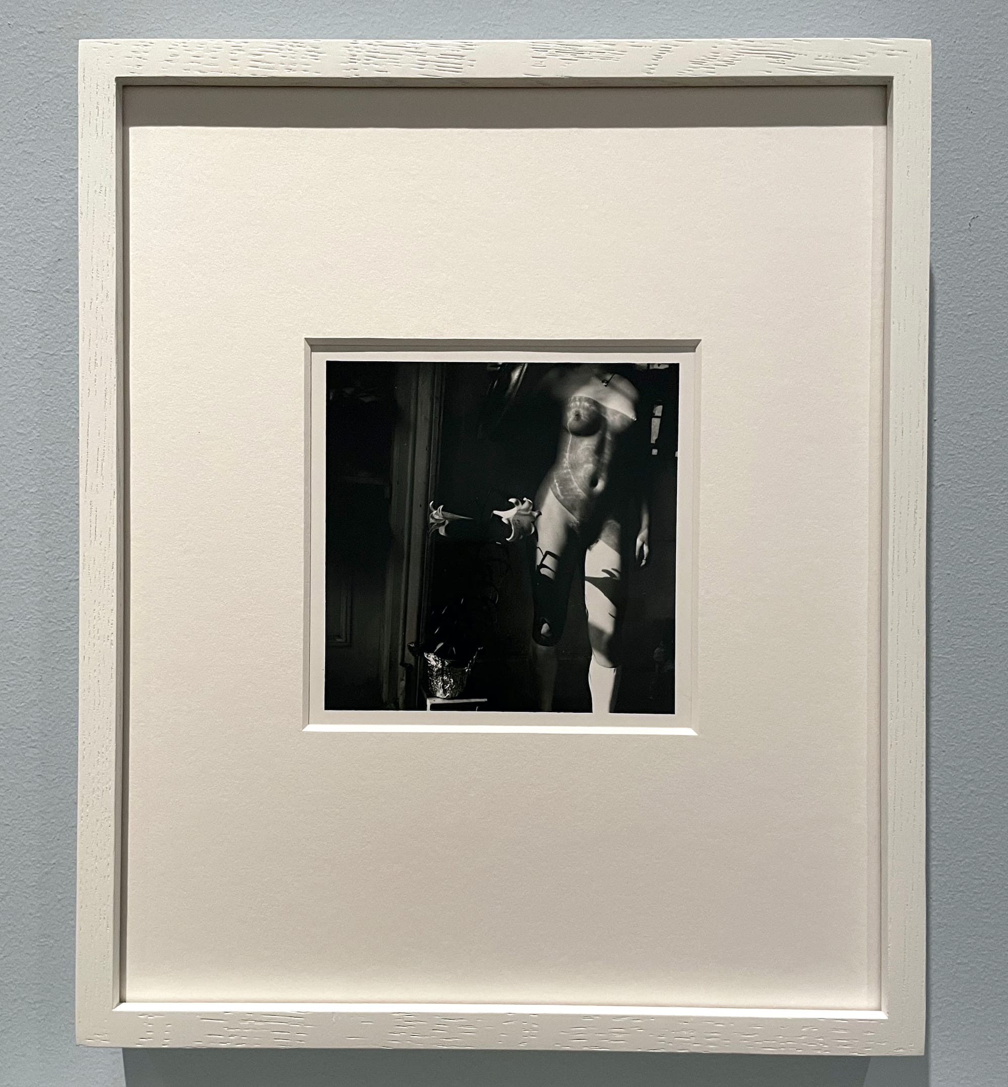 Woodman’s works are joined in this section by Cameron’s images of Julia Jackson, her niece and one of her most frequent subjects. Across multiple photographs, Cameron counters the bluntness of Woodman’s male-female dynamic with attentive affection for Jackson, of whom she wrote “she walks in beauty” (quoted in the exhibition catalog). In “My Favourite Picture of all My Works (Julia Jackson)” (1867), the light on Jackson’s face sculpts her features, nearly transforming her into a marble statue, while her expression suggests melancholy, invoking both timelessness and mortality. Similarly, with “The Angel at the Sepulchre” (1869–70), soft light on sitter Mary Hillier’s face uplifts her distant gaze. The dark background casts her luminous skin into relief, while white lilies — the only other bright area in the image — reflect their grace and ephemerality onto the sitter. It’s both allegorical and real, raising Hillier to the level of the spiritual. In contrast to Woodman’s images of men, as well as many faceless women, including herself, Cameron’s devotion to the fine details of faces and expressions and to her ideals of beauty articulate a distinctly queer visual realm, marked by closeness among women.