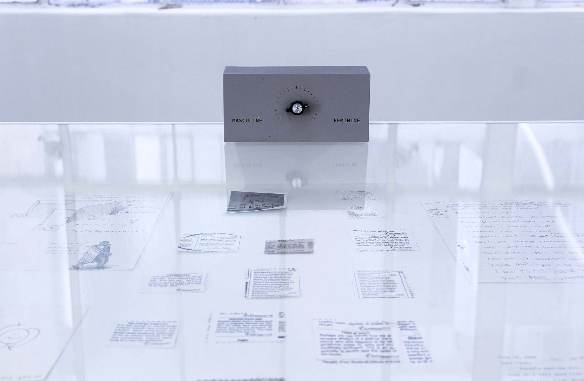 In contrast to this work, however, Garner’s provocative concepts also have a spotlight at Joan. Garner, a transgender woman, created numerous hypothetical products that queered traditional expressions of gender and sex. Enclosed in three vitrines are ephemera that chart Garner’s exploration of her own identity through invention. There are drawings of undergarments that would give the wearer an hourglass figure, and a concept for the “Breast Enlarger,” a monitor worn on a flat chest that displays a much larger bosom. Atop the vitrines is a prototype for the “Genderometer” (1985–2021), a simple box with a knob that twists from masculine to feminine and can stop at any point in between.