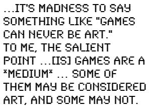 My own position is that at the very least it’s madness to say something like “games can never be art.” To me, the salient point to remember in these discussions is that games are a *medium* — many things can be expressed through a particular medium, and some of them may be considered art, and some may not. In TV, not many people think of Lamb Chop’s Play-Along as art, at least not “high art,” but a lot of people would argue passionately that something like The Wire definitely is.