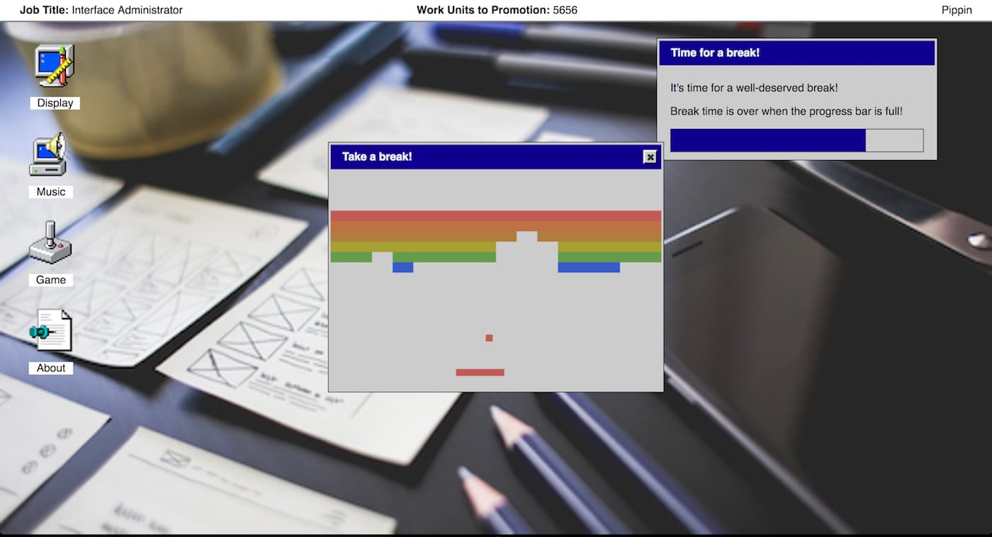 It’s also a sadly accurate simulation of many offices, where attempts to get work done are constantly derailed by work motivation, whether meetings, messages, emails, or just a particularly aggravating motivational poster. Barr often experiments with game structures for unconventional play, such as his digital take on Marina Abramović’s “The Artist Is Present,” and the v r 3 museum of rendered water launched earlier this year. Players begin It is as if you were doing work as a lowly “Screen Administrator,” before progressing through meaningless tasks and some enforced “breaks” to play Breakout, and being promoted to titles like “Big Data Administrator.” You’re rewarded with perky sound effects and pop-up windows, yet the job always stays the same. The only things you can change are your desktop backdrop (a cat and a photograph of a messy desk being options) and the looping MIDI music, including a “world” selection that has a grating pan flute accompaniment.