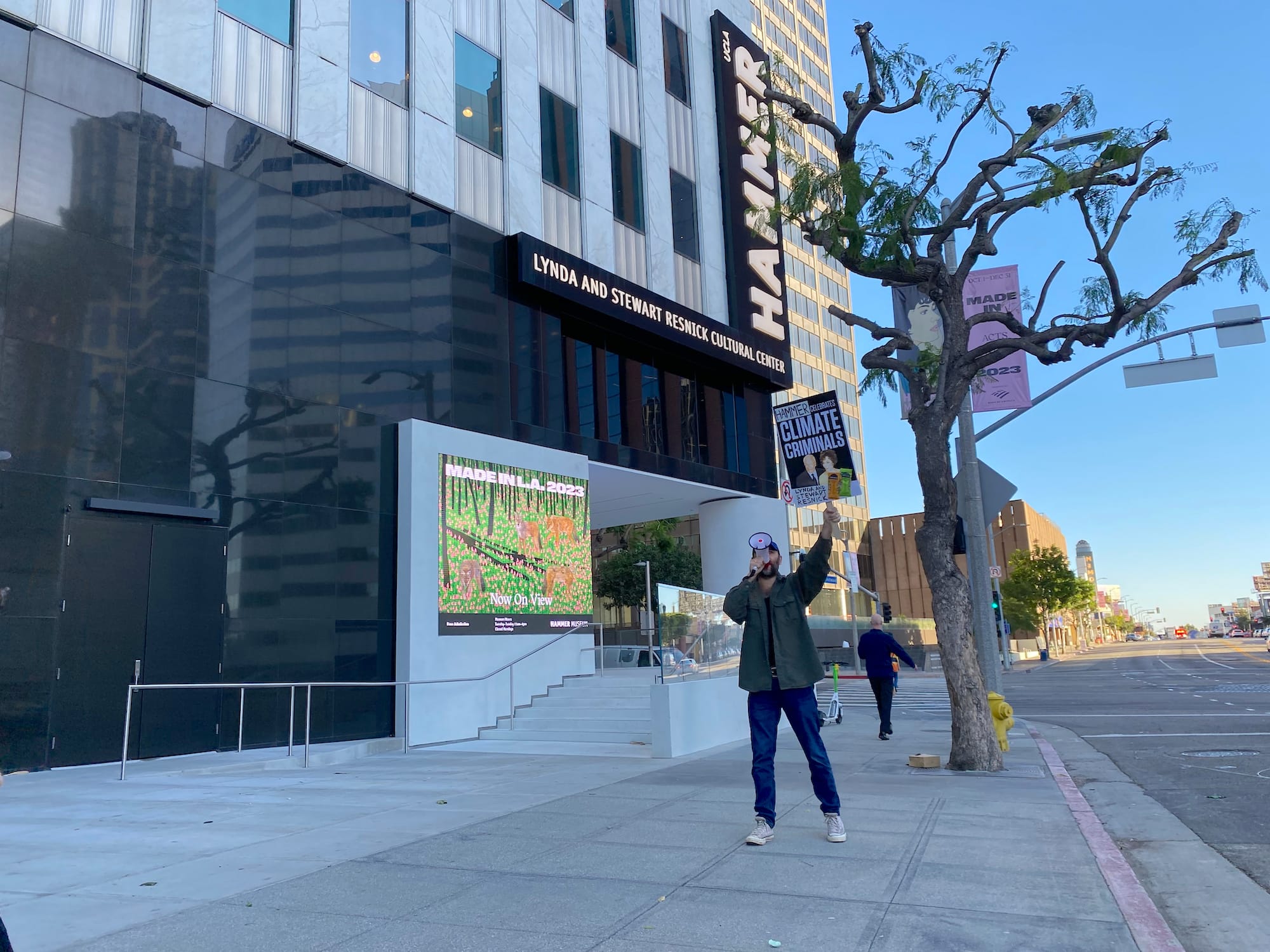 LOS ANGELES — “The Hammer Museum artwashes climate criminals!" shouted Yasha Levine through a megaphone in the middle of the institution's courtyard yesterday, November 8. He and Evgenia Kovda, his wife, were there to stage a two-person protest targeting Lynda and Stewart Resnick, whose $30 million donation, the largest in the Hammer’s history, made possible a recent expansion and renovation dubbed the Lynda and Stewart Resnick Cultural Center.