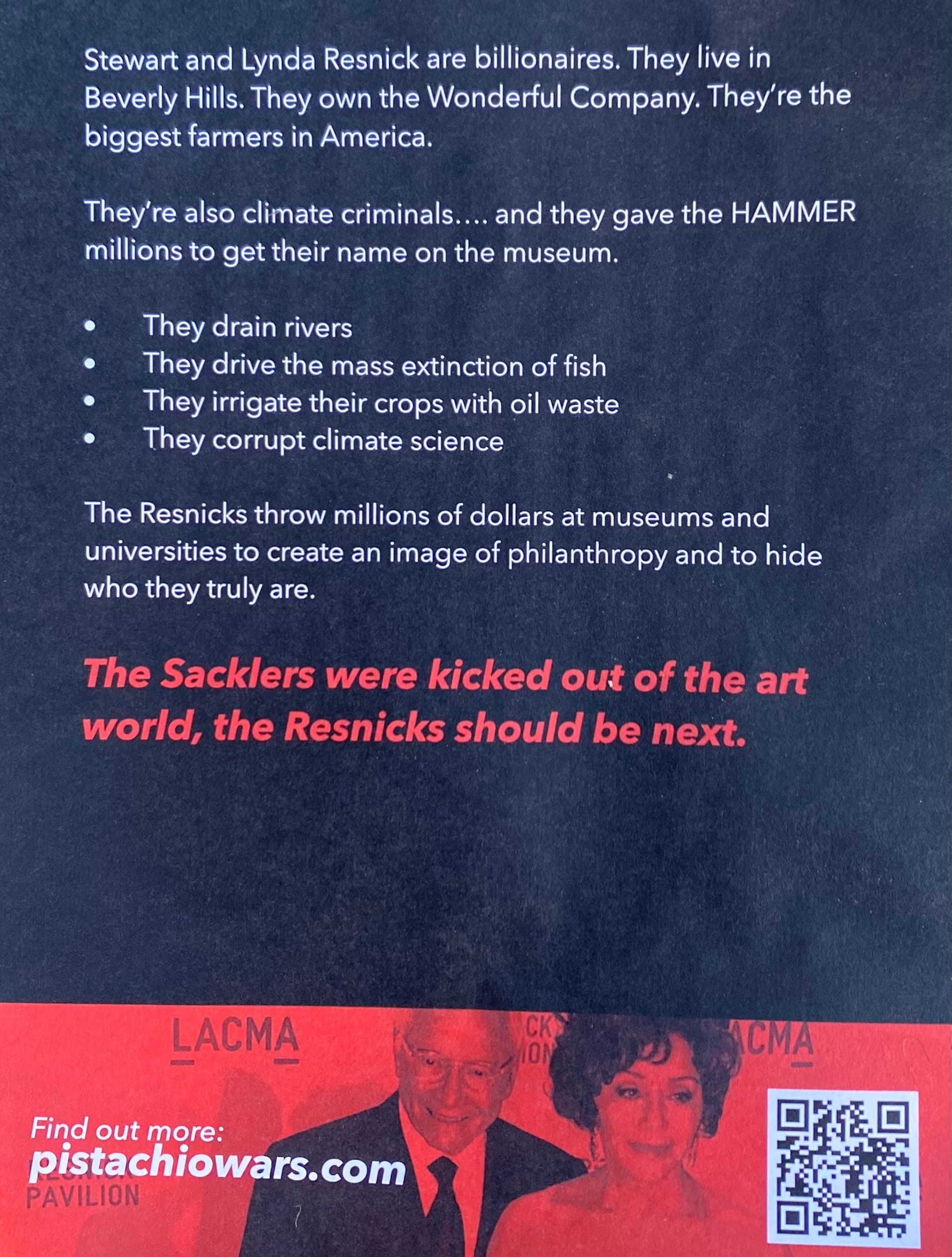 Both the LACMA and Hammer demonstrations were admittedly small, attended only by Levine and Kovda, and somewhat awkward, more like performance art than a traditional protest. But they come in the wake of a much larger exposé on the Resnicks, a forthcoming documentary titled Pistachio Wars that Levine has been working on for the better part of a decade with his filmmaking partner Rowan Wernham.