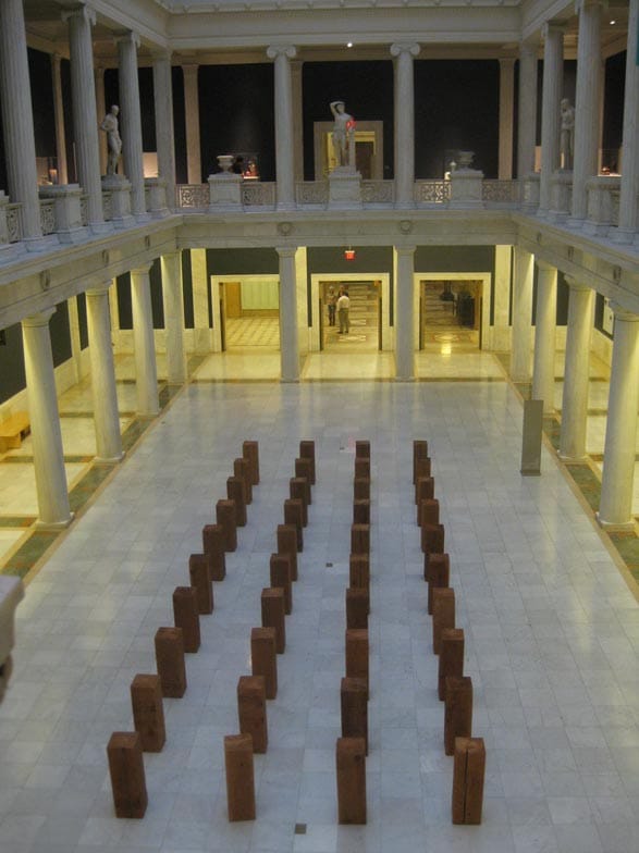 Stepping out of the Palm Springs show I entered what’s become my favorite room at the Carnegie, the Hall of Sculpture. The curators consistently find the sweet spot between the antique and the modern here. This time, contemporary art was represented by Carl Andre’s “Fallen Timbers” (1980). The sculpture holds its ground and its power in the company of the permanent inhabitants of the room. Pitch-perfect.