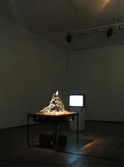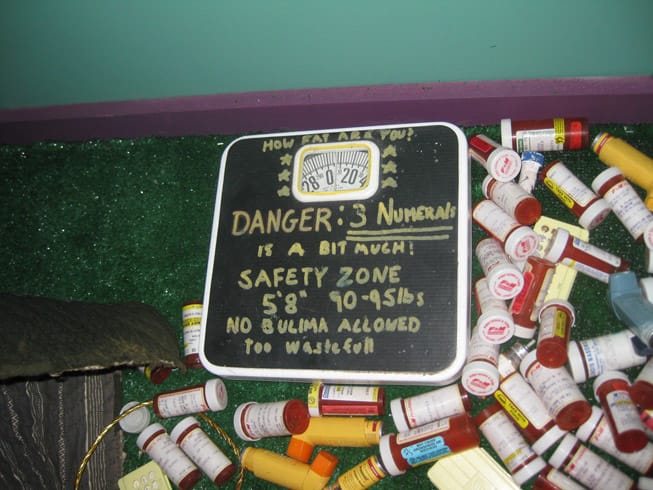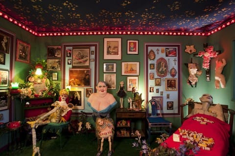 A new addition to the Mattress Factory’s permanent collection is an installation by Greer Lankton that was first shown here in 1996, just before the artist’s death. “It’s all about ME, Not You” (1996) wasn’t just on my Top 10 list this year. It was my Top 10 list. Viewed mostly through tears, the work addresses just about every issue that’s been important to the art world for the last 30 years: identity, religion, disease, fame, sex, the body, gender, addiction. Not necessarily in that order, but all at once. The gates are wide open here. It’s as beautiful as it is horrible, populated with Lankton’s dolls, altars, empty pill bottles, and bathroom scale warnings. The space is about the size of Lankton’s East Village apartment, but from the outside it has the appearance of a suburban home transplanted into a toy train set. In the end, we’re outside looking in, but in spite of the title’s warning the work isn’t just about her, it’s about both of us.