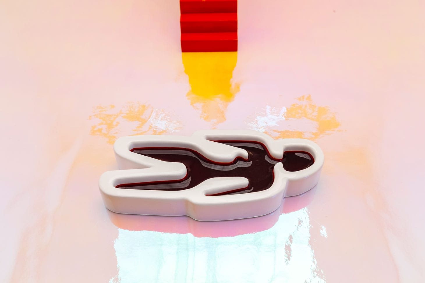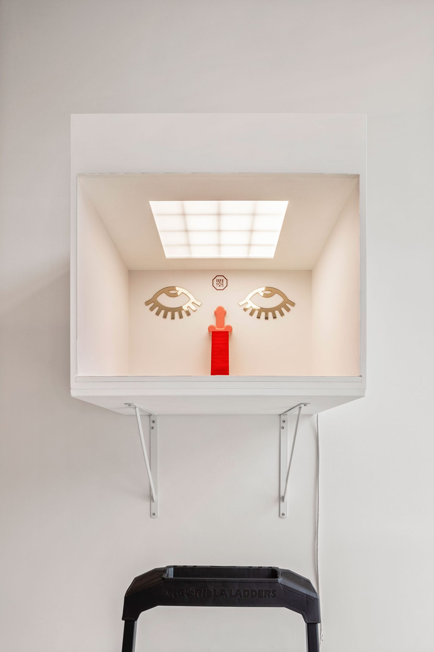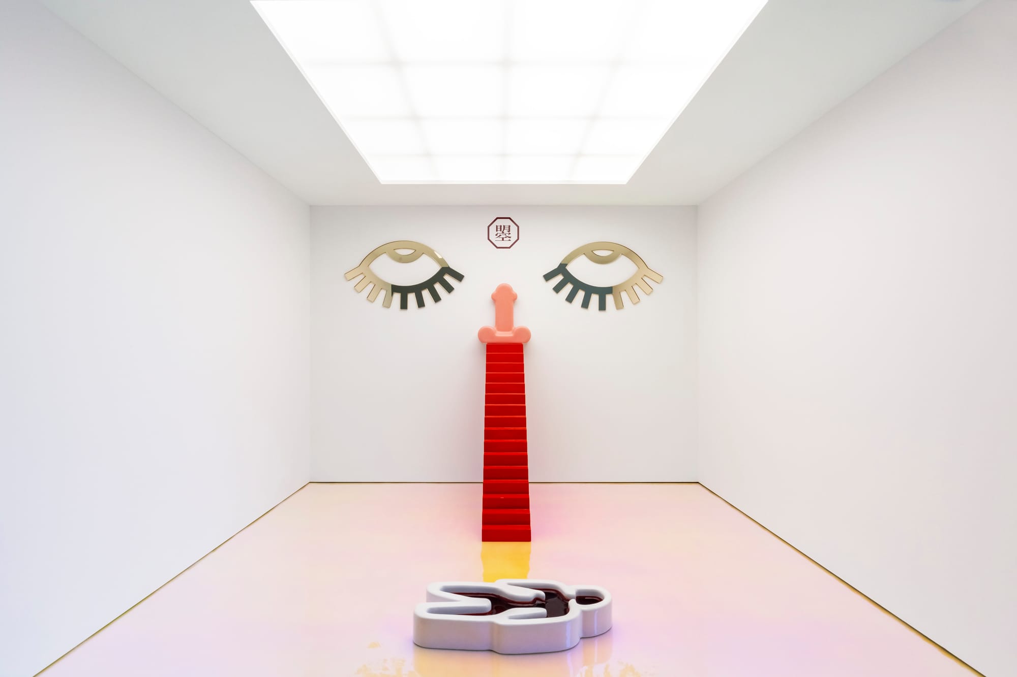 Perhaps feeling that her evils have not been given due attention, Pixy started her larger conceptual series Evil Women Cult, an imaginary cult that worships all evil female leaders in history. “Temple for Her,” a sculpture dedicated to Wu Zetian, the only female Emperor in the history of China, stands at one end of the gallery, suspended a few feet above the ground. The viewer must climb up a utility ladder to look into the white box. Inside, a narrow, steep red staircase ascends to a pink phallic throne. At the foot of the stairs lies a sacrificial pool of blood in the shape of a woman. Balancing on top of a ladder in a Chelsea gallery and beholding a sculpture only visible to oneself, the viewer feels the loneliness that must have accompanied Emperor Wu on her ascension to power; the work elicits a feeling closer to sympathy than admiration.