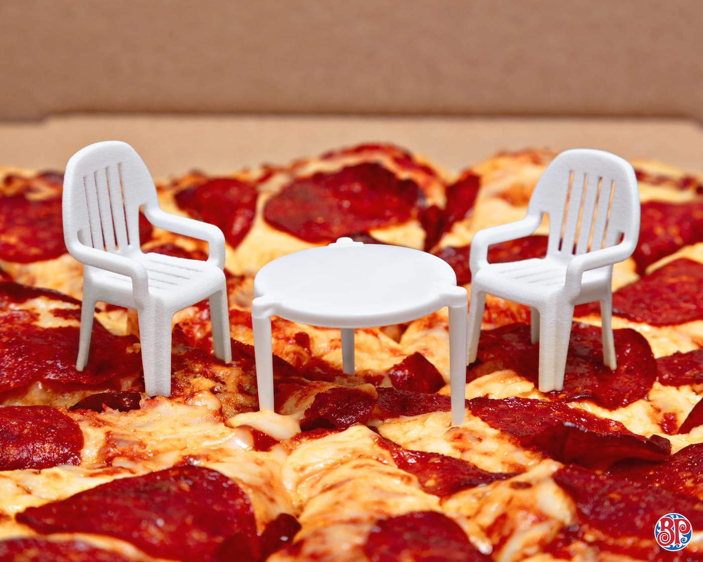 For a long time, I thought I was the only one who loved opening pizza boxes for the sole purpose of imagining two very tiny people seated at the little hunk of plastic inside — the table-like object keeping the top of the pie away from the box. But at Canadian pizza restaurant Boston Pizza, the invisible mini-people have chairs, too. The restaurant partnered with advertising agency John st. to create the Pizza Patio Set, available in a limited run for the summer. The Pizza Patio set consists of “the pizza saver,” plus two thumb-sized patio chairs — scaled-down reproductions of real outdoor furniture sets — 3D-printed with food safe materials and nestled into warm, melted cheese.