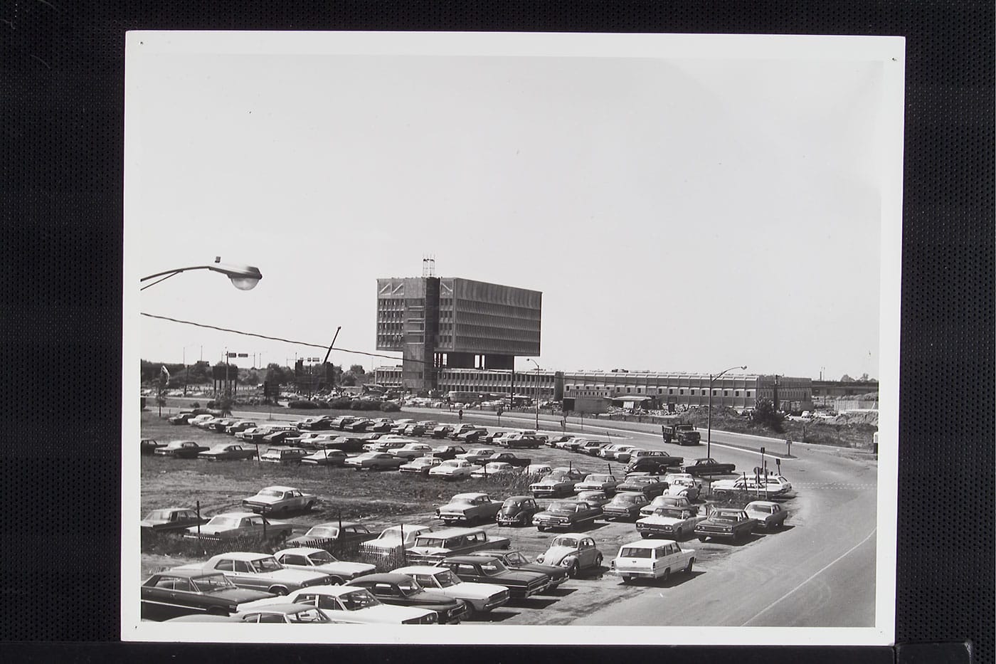 For Burr, the project offered a chance to return home and “lean into the autobiographical aspects of his work,” said Feinberger. The artist was born in New Haven in 1963 and grew up under the visionary spell of Modernism, which saw the city attempt to increase the quality of life for residents through a government-funded building program that added highway connectors to inner-city neighborhoods and renovated so-called “blighted” blocks. (In fact, the effects were largely negative, and urban planners are beginning to remediate them today.) Burr lived next to renowned architect Kevin Roche, who was brought in to aid the building efforts of the time and gave the artist one of his first jobs. “He was a modernist, and my family was not,” Burr told Hyperallergic. “I loved that he only had black and white cars. In that time, Modernism was a style and lifestyle.” The romantic promise of Modernism also captured the imagination of Mayor Richard C. Lee, who embraced the urban renewal project with the goal of earning New Haven the reputation of America’s “model city.” Lee granted George F. Armstrong permission to purchase the land for his Rubber Company on the condition that he’d commission a world-renowned architect to design the structure. One year later, Breuer’s design was selected, and then built with a whopping price tag of $7 million.