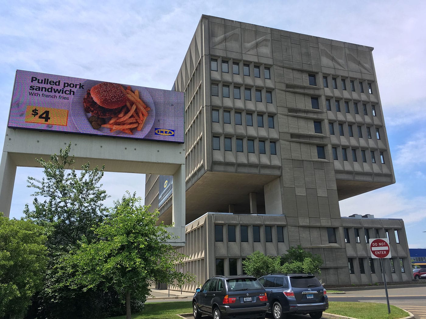 NEW HAVEN — Art has again unlocked the doors to this city’s vacated Marcel Breuer building. Known for its Brutalist design that features a gaping hole where the third and fourth floors should be, the 1969 structure has survived thanks to the efforts of local activists, who got it listed on the State Register of Historic Places in 2000. While the towering executive offices still stand, the adjacent two-story wing of the former Armstrong Rubber Company and Pirelli Tire company was demolished by its new owner, Ikea, in 2003 to make room for 150 more parking spaces in front of a new store.