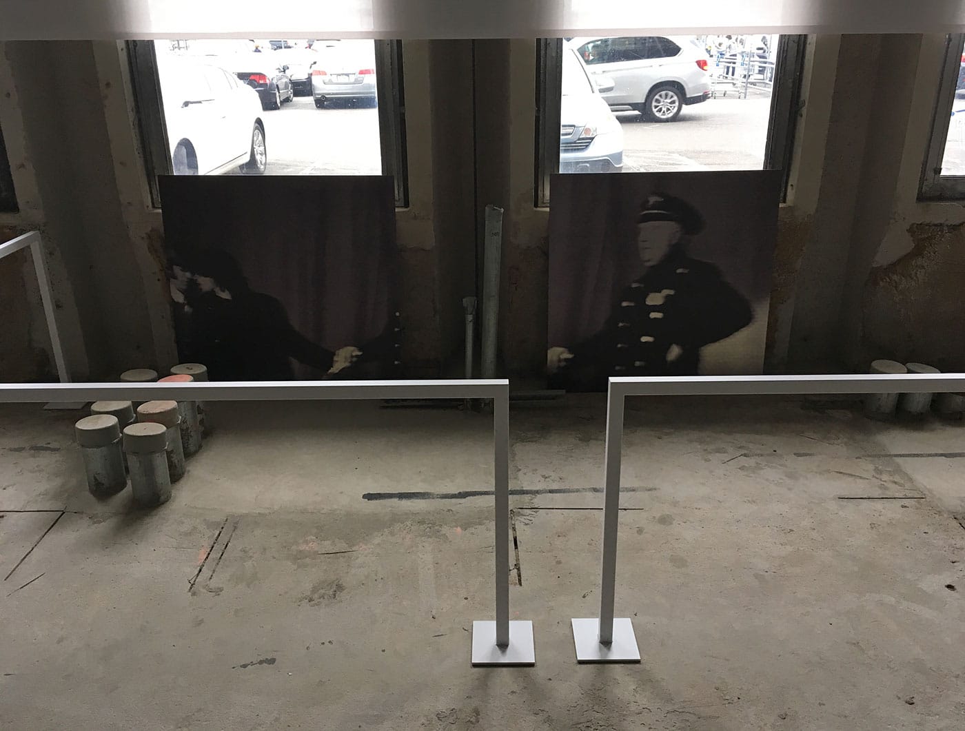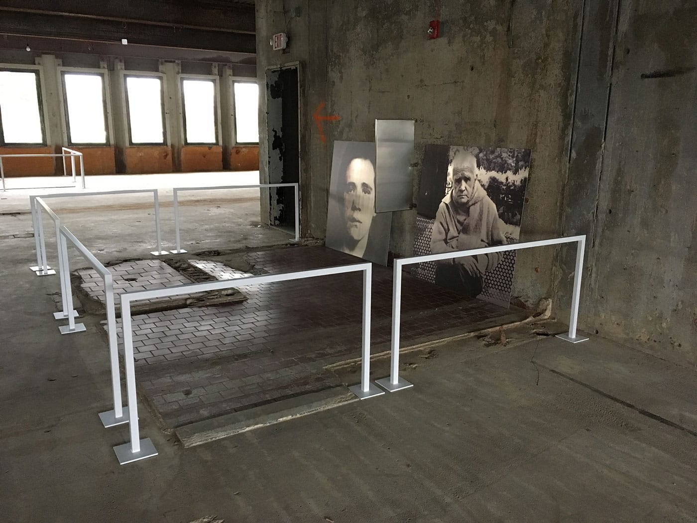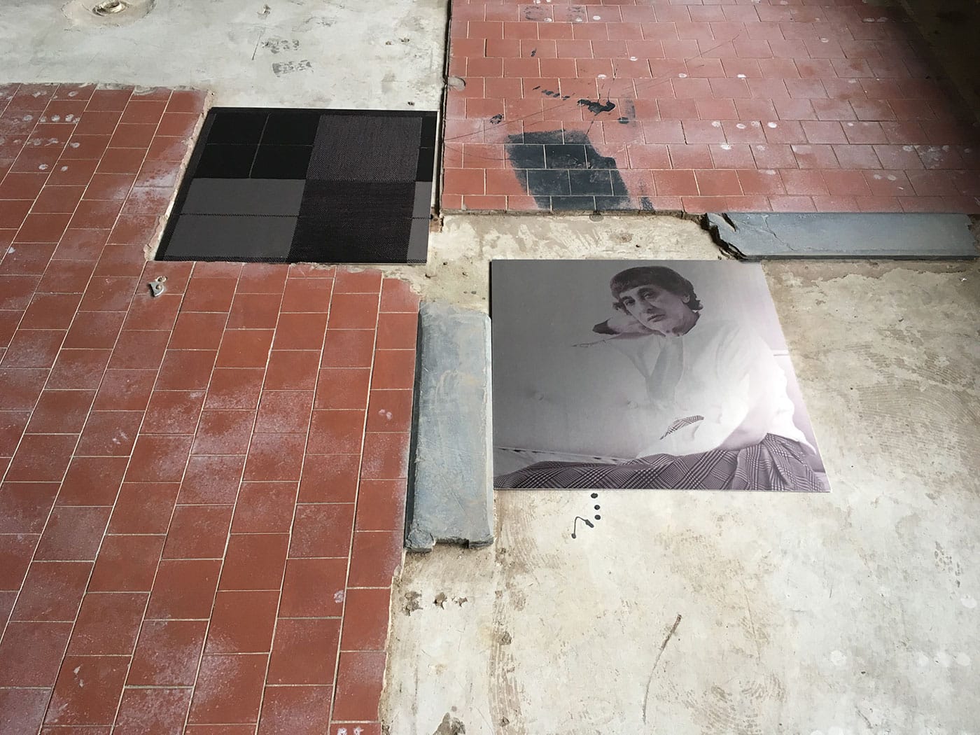 Images of these figures populate Body/Building, where they’re juxtaposed with the forms of Brutalist architecture (Burr did something similar in his 2002 Bulletin Board Series, which also features New Haven). The most compelling part of the show is the way Burr has brilliantly staged each work in a hazardous section of the building that doesn’t meet the city’s code-compliant standards; rather than add stanchions, he has designed barriers that double as skins and frames for his art. One example is a steel railing that prevents viewers from stumbling into a shallow concrete pit; the full transcript of Jean Genet’s 1970 May Day speech given on the New Haven Green is engraved across it. As they read, viewers may notice themselves reflected in the surface, a metaphor for the way time bends, progress fails, and history often repeats itself. A few feet away, a large aluminum print of Anni Albers lies flat between two choppy sections of the building’s original tiles; in this way, her image both prevents viewers from stubbing a toe and serves as a symbol of horizontal power structures. In a far corner, a picture of Jim Morrison touching cheeks with a male bandmate while getting pulled offstage by New Haven’s police chief is tucked between a slalom of exposed pipes. The photograph flags a space of potential bodily injury and also connects poignantly with Burr’s aforementioned writing on corner bars.