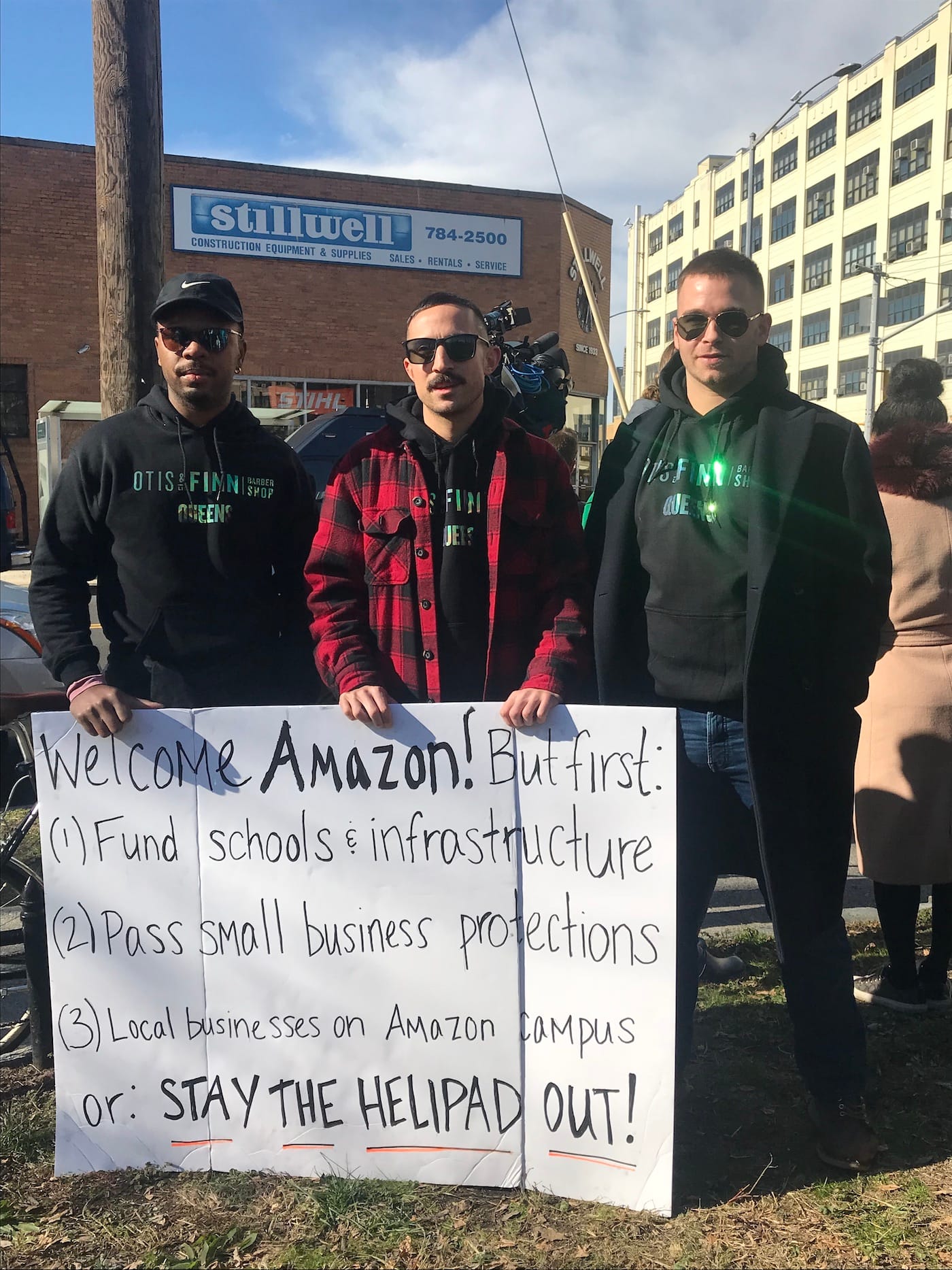 At the rally, three men representing a local barbershop called Otis & Finn arrived with a large protest sign that demanded school funding, infrastructure reform, and aid to local businesses. The sign noted that if Amazon could not support the LIC community, the company could “STAY THE HELIPAD OUT!”