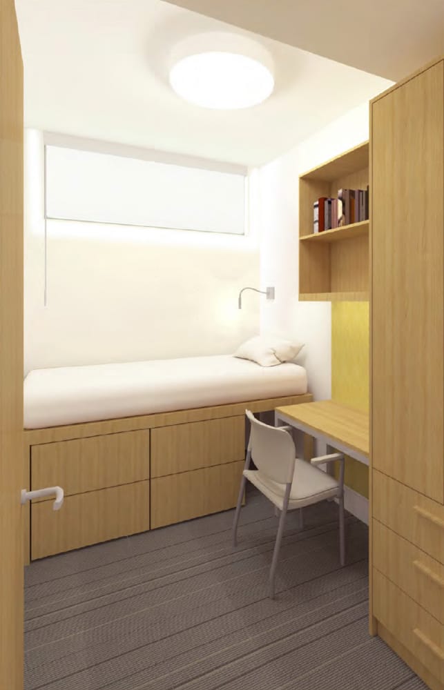 How well or poorly the design of Munger Hall will promote the communal aspect of dorm life relies on its novel bedroom design. The mostly windowless chambers will be furnished with the bare essentials of a bed, desk, and wardrobe — nothing more will fit. It is a bit of social engineering designed to nudge students out of their bedrooms and into the communal spaces throughout the building, such as the kitchens and great rooms in each of the houses or “our town in the sky,” as the penthouse level is called in design materials. The same spartan furnishings and absent windows that have drawn ire are thus the crucial elements for the building’s intended use and function.