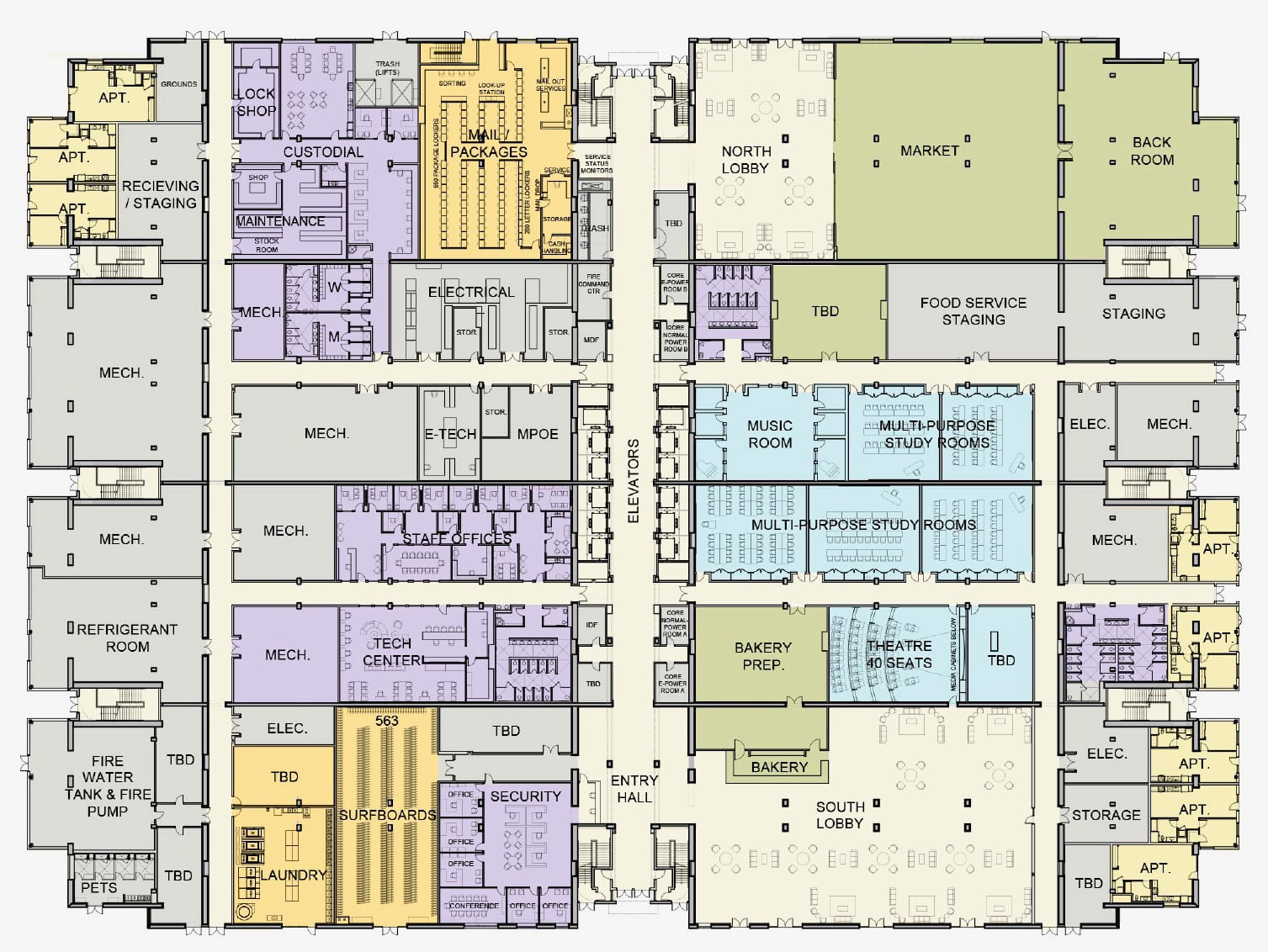 Munger is not a trained architect. However, working with the architect of record for the project, Los Angeles-based VTBS Architects, he has reportedly steered the dorm’s design from the beginning. Hence, those windowless rooms. In an illuminating interview with Architectural Record, Munger asserted that the preponderance of interior bedrooms was a functional outcome after he ruled out shared sleeping rooms and optimized the communal spaces, such as the fitness center and gastro pub slated for the penthouse level. “We had a window shortage,” he told the magazine, “So we just copied what Disney Cruise did.” Indeed, the project design team is touting “virtual windows” that will provide “circadian rhythm lighting” as well as a robust ventilation system to provide fresh air.