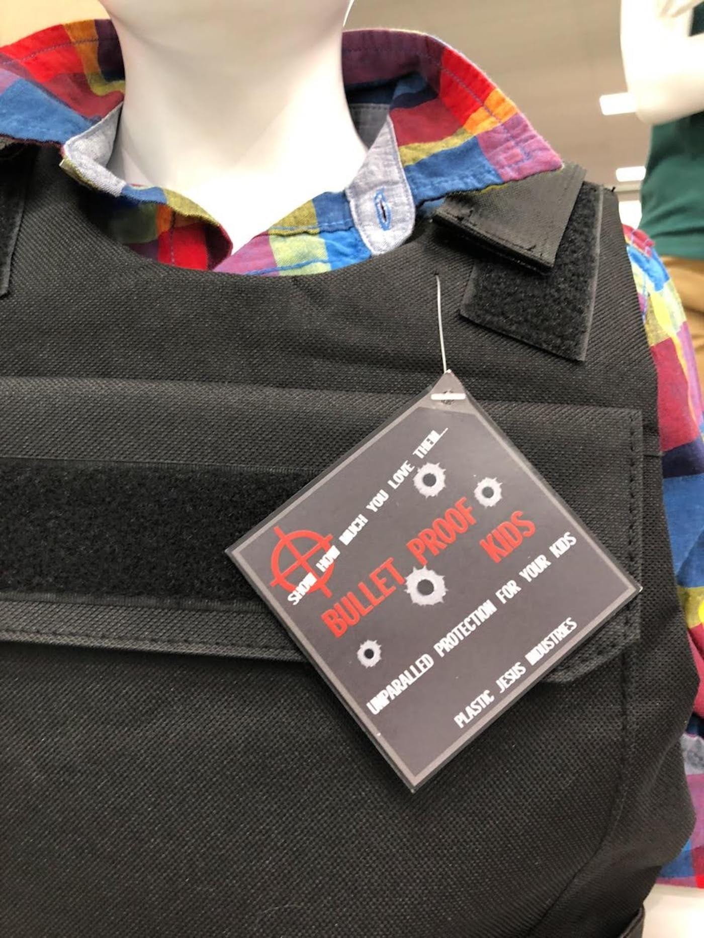 The sales pitch on the tags of Plastic Jesus’ bulletproof vests reads: “No More Need for Thoughts and Prayers — Let your child know how much you love them — Money Back Gaurantee — Don’t let your child be the next victim.”