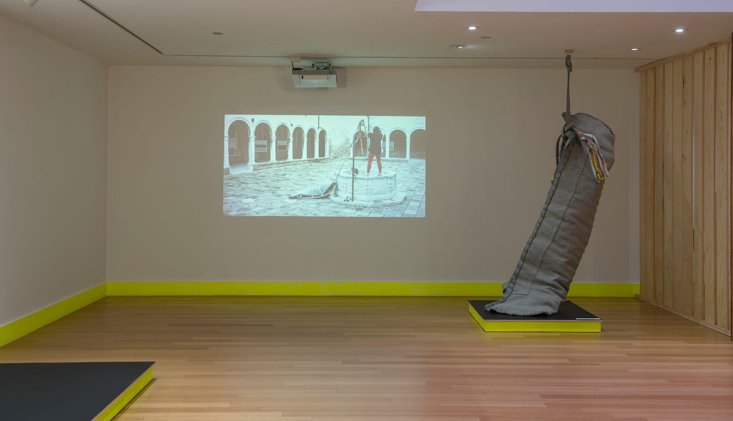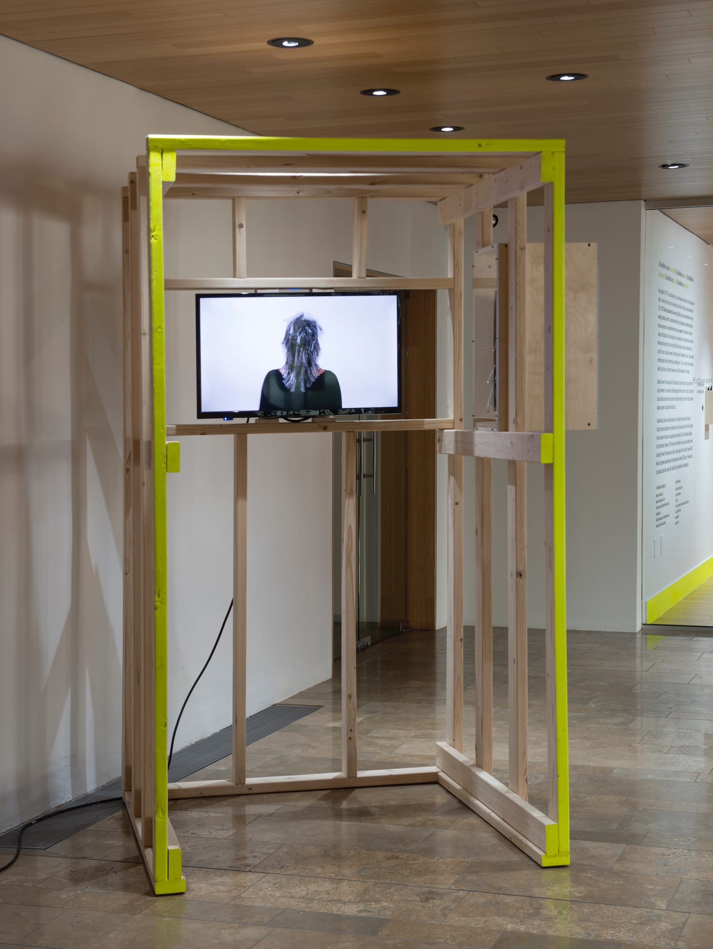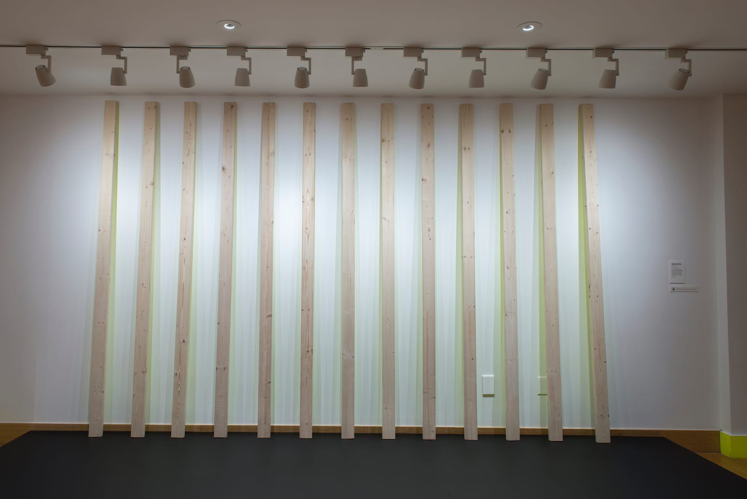 On opening night, Hupfield borrowed a two by four plank from one of her sculptures and performed a kind of sparring ceremonial dance with her collaborative partner. A procession followed back to the gallery led by the artist, where she proceeded to grab a microphone and colored ribbons from a different sculpture. Her partner used the microphone to sing a Hawaiian welcome chant as Hupfield gestured with the ribbons like burning sage so as to bless the gallery space. This event is now featured as documentation on one of three flat screen televisions, the other two still waiting to be filled by future performances by the artist.