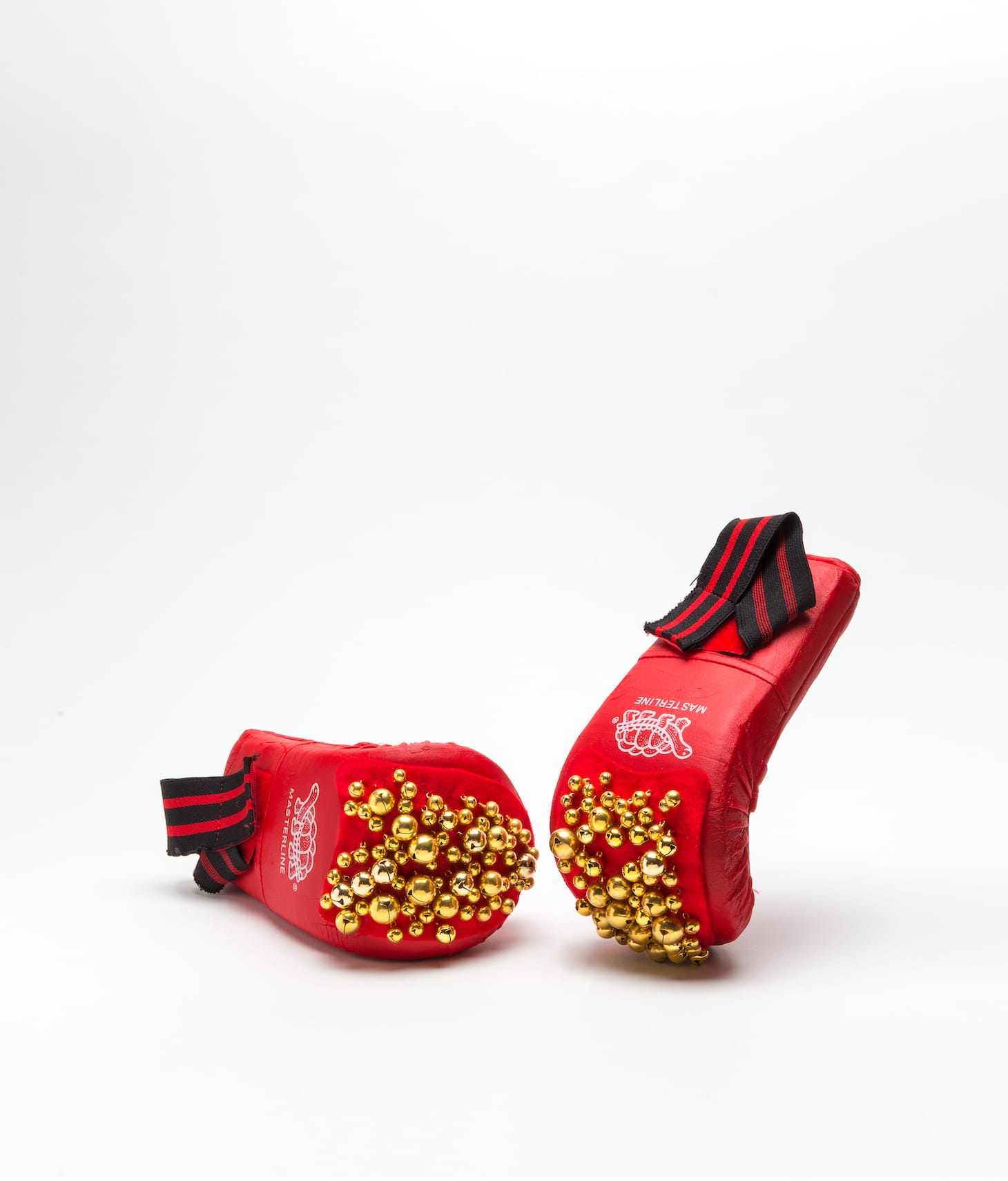 The entirety of the exhibition is inexorably linked to the body in context to Hupfield’s creations. The center of the gallery features a slightly raised platform with a series of simple wooden structures standing in for the human form, each one propping up wearable items that Hupfield has activated at various performances. “Golden Dollar (Sacagawea)” is a hood comprised of 500 US Sacagawea dollar coins — a direct reference to the 500 years of occupation on Indigenous lands. The hood, which alludes to a kind of chainmail, acts as both protection and protest.