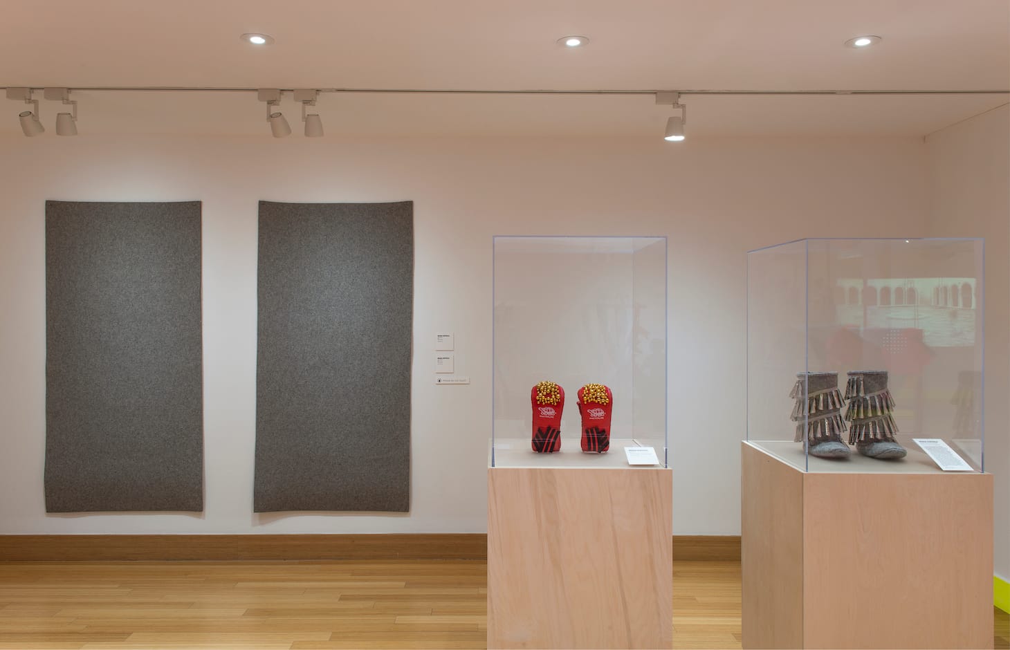 “Trophy Case” presents a playful take on archives, but nonetheless has significant ramifications. The case — which holds whistles made of bones, a coffee cup and headphones made of industrial gray felt, and other objects — has holes drilled into the glass, as with all the cases in the exhibition. This intervention determines the objects as living and breathing entities and not just static mementos from a dormant culture, as objects tend to become within a colonial framework.