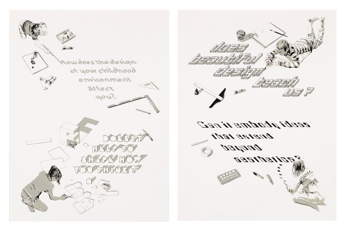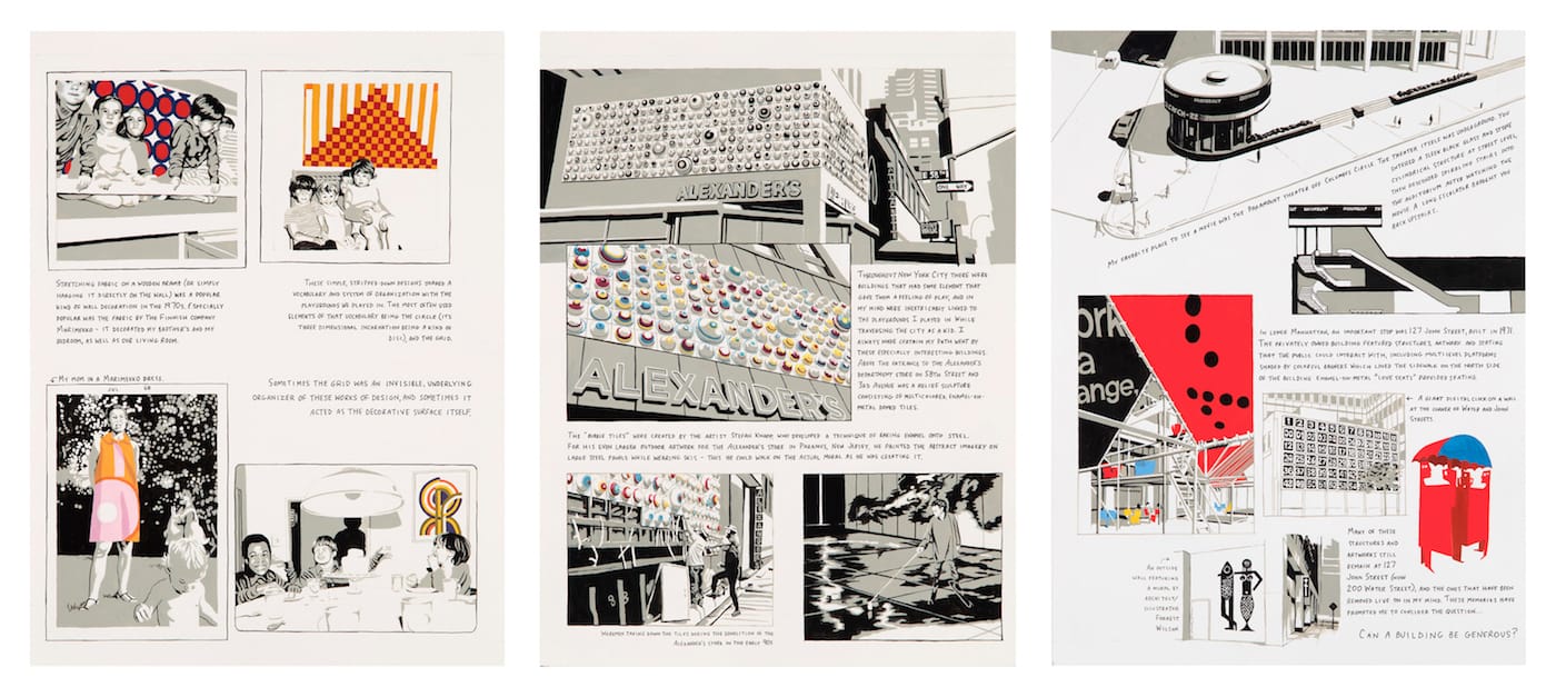 Julia Jacquette’s Playground of My Mind is a graphic novel that weaves memoir with the rise of the adventure playground in the 1960s and ’70s. Growing up in Manhattan, the future artist played on modernist forms inspired by ancient pyramids and amphitheaters in Richard Dattner’s Adventure Playground in Central Park, and explored the tiered levels in the “miniature city within the larger city” created by M. Paul Friedberg in the courtyard of her Columbus Park Towers home. As an adult, it was not just the designs of the playgrounds with their gridded systems and sculptural shapes that would influence her paintings, but also the experience in the flow of energy and activity offered by their architecture.