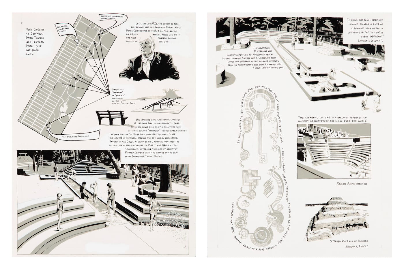Yet Jacquette’s visual narrative emphasizes the lasting creativity encouraged by engaging with these playgrounds. She quotes Richard Dattner, who once said: “The next best thing to a playground that children designed themselves is a playground that an adult designed, but incorporating the possibility for children to create their own places with in.” As she concludes, these sites instilled in her the idea of an artistic work place “as an arena of unjudged, unlimited, joyful play.”