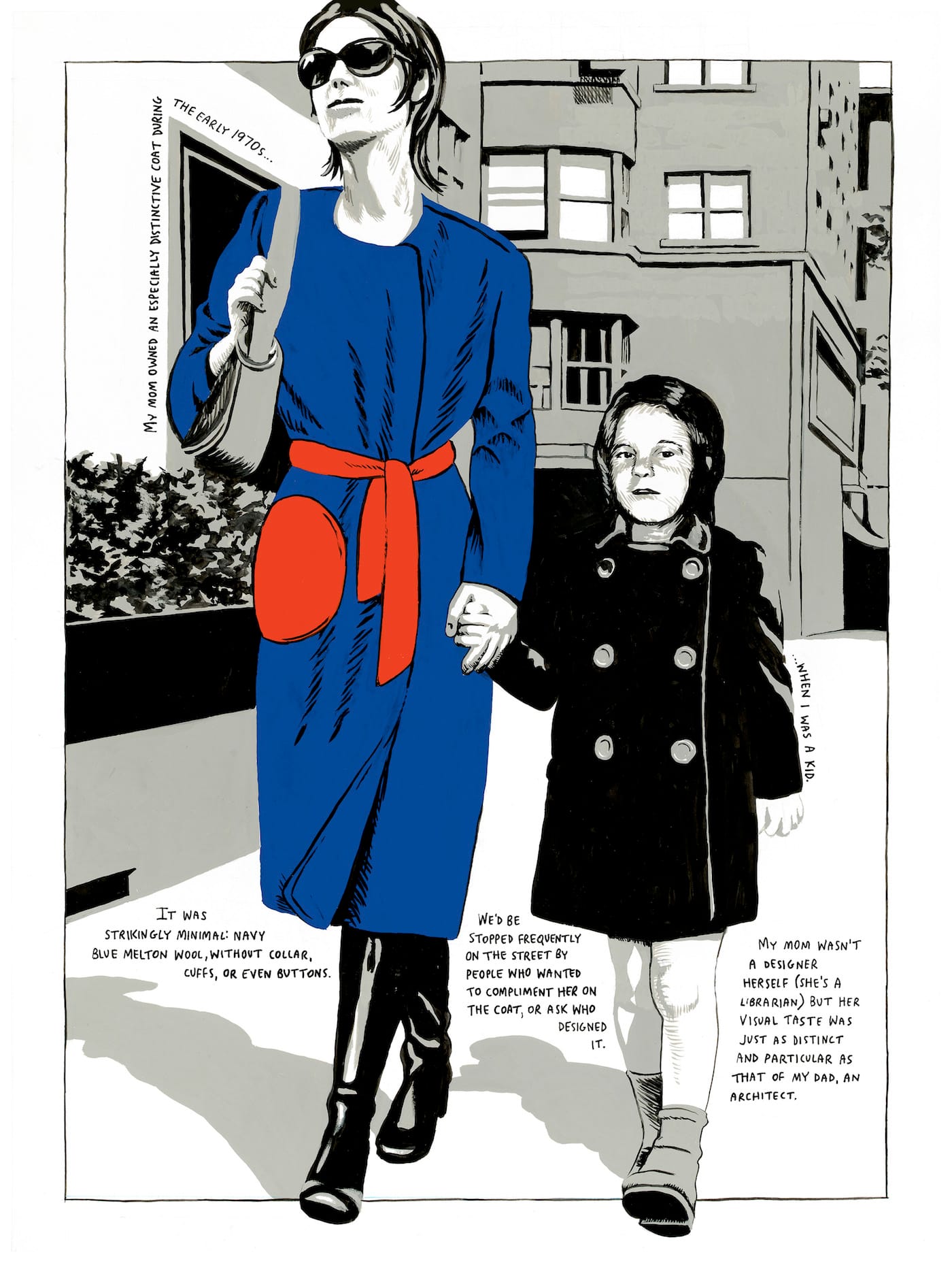 Julia Jacquette: Unrequited and Acts of Play, now on view at the Wellin Museum in Clinton, New York, includes 60 gouache works she created for Playground of My Mind, amid a career survey of her advertising-influenced art. A version of the exhibition will travel to the Visual Arts Center of New Jersey in Summit, New Jersey, in September. Her illustrations in the publication picture the past vividly, in a subdued palette of gray punctuated by color, such as her mother’s distinctive 1970s blue wool coat adorned with a red circle. Jacquette also breaks down the playgrounds into diagrams, with details of their textures and interactions.