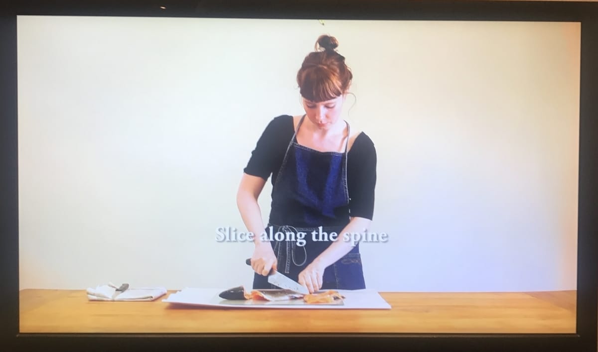 Nina Ross’s video piece “Untitled #1 (Fish)” (2017) shows a woman filleting a fish and learning Norwegian by getting directions for each next steps in that language. She’s not fluent, and we watch her linger on words she doesn’t recognize, then learn and internalize them by doing. There are some puns here because, with all due respect, the Norwegian vocabulary sounds, to my English ears, a bit squishy — like fish. Given that fish has been a major food staple in Norway for centuries, it’s intriguing to reflect on how Norwegian terms for its preparation can function as onomatopoeia.