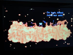 Eddo Stern’s “Earthling” (2011) casts you as an assembly line of gold miners. Each button on the controller controls a different worker in the production process. And by tapping away on the buttons, you extract, crush, melt, shape it into bar and then ship it off on horseback. The game commands you to produce 20 bars. Although it takes several minutes, the alluring and glowing graphics lead you to anticipate a rewarding cinematic ending once you win.