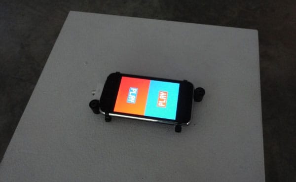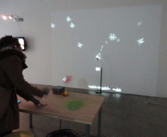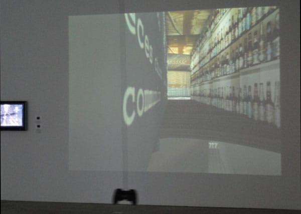 “Swatter” (2011) by Joe McKay is an addictive game of kill the roaches. In the primitive early 1980s monochromatic white line idiom, you are a rapid firing triangle in a field of crudely rendered roaches. You pivot your aim with a wooden knob and hit a green insect swatter on the table to fire. You end up swatting furiously to fire off as many bullets as possible, which becomes inconsiderately loud in the space but deeply pleasing to the suppressed Neanderthal within.