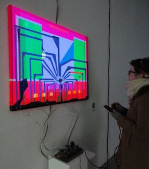 “Electric Paint 2.0” is the most steam punk piece in the show. Mike Beradino actually took apart an Atari console and accompanying cartridge and re-assembled and re-wired it into this feedback loop painting, where you can see a vague image of the game on the painting itself. The colors and lines shift in response to the game. It’s a little tough to get the hang of the game interface, so it’s worth asking someone in the gallery for a tutorial. Nevertheless, it’s pretty wild to see this half-painting/half-game melded object.