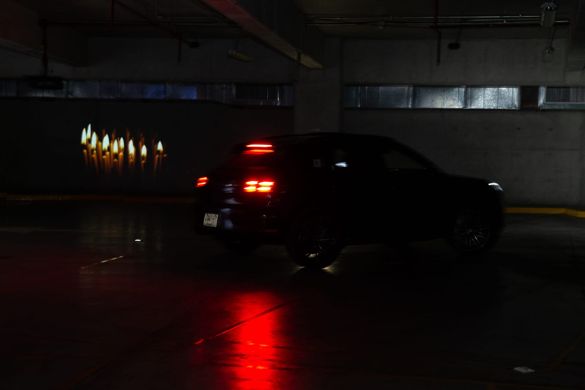 "We wanted to create an experience that was completely different from a traditional exhibition space. Not just because you're in a car, but because museums are usually perfectly illuminated, without any real sense of drama," said Garza Usabiaga. "The title, Objects In the Mirror Are Closer Than They Appear, refers to how you can see the works both in front of you and as you drive away, in your rear-view mirrors. I was very interested in this idea of strange perception."