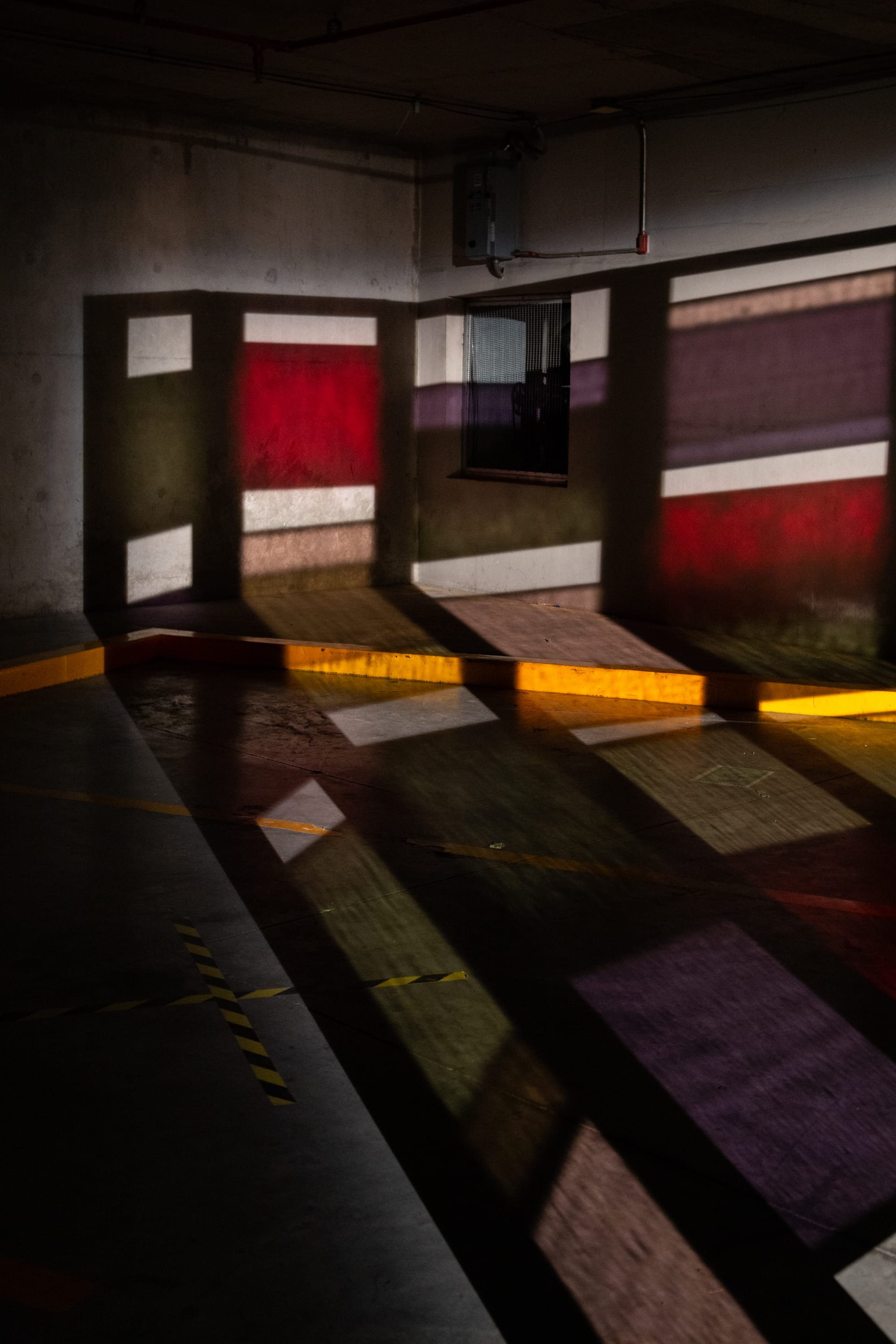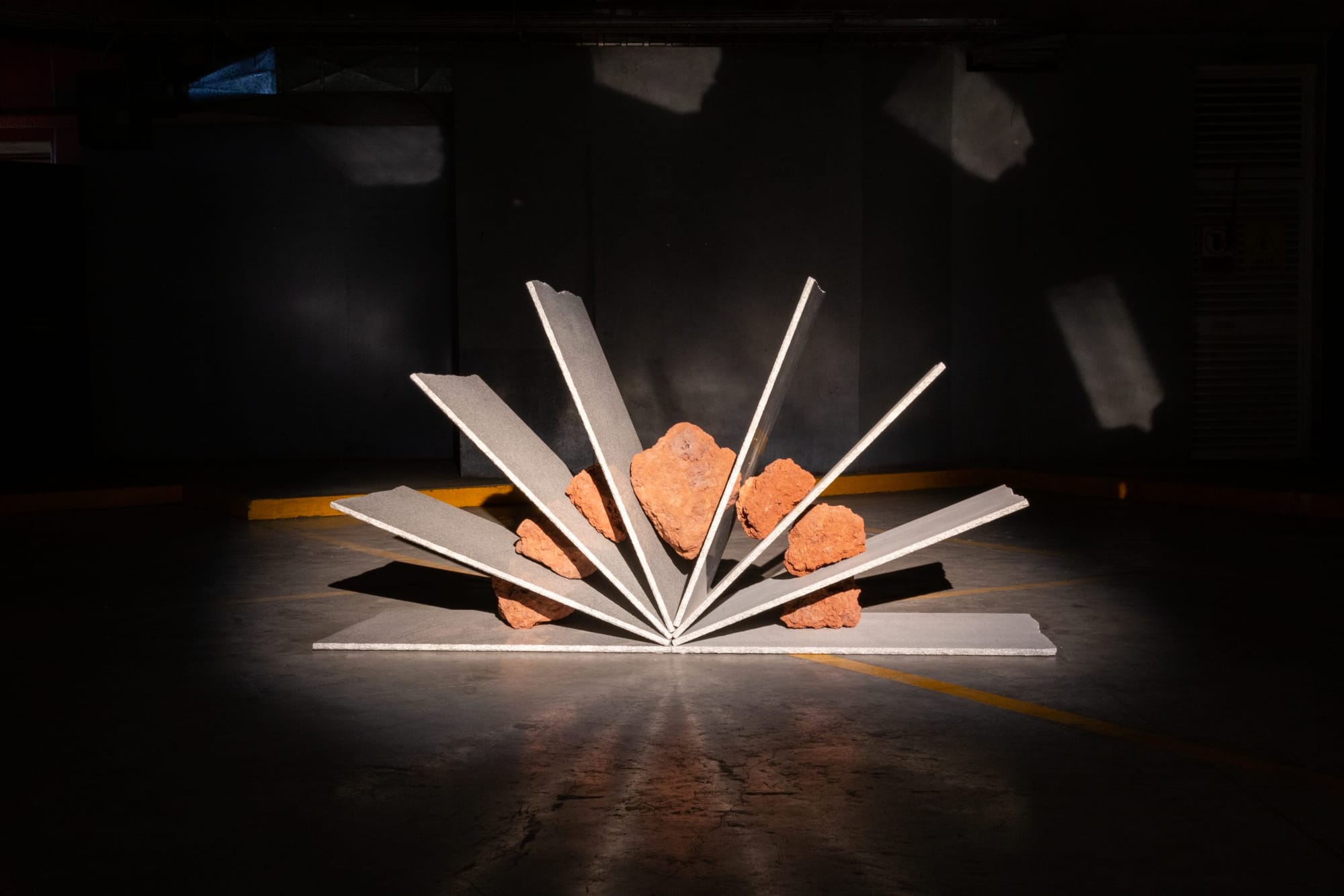 The result was a delightfully unconventional experience of art: Museo Autoservicio couldn't be further from a white-wall gallery. Artworks are dramatically illuminated in the tenebrous parking lot, producing an effect that is more theatrical than institutional. Pieces like Sofía Taboas's "Cualquier Abertura Filtrada, Giratorio" (2019), a tinted glass sculpture resembling a folding screen, engages directly with the specific lighting of the space, reflecting a kaleidoscopic multicolor geometric grid on the cement floor.