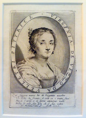 Just under the engraving’s oval frame-with-a-frame, there is another inscription, which praises the beauty of her art (“Mira le tele” — “Gaze at the canvases”) over that of her face and eyes, which one could read as a moral that physical beauty is temporal, while art is eternal.
