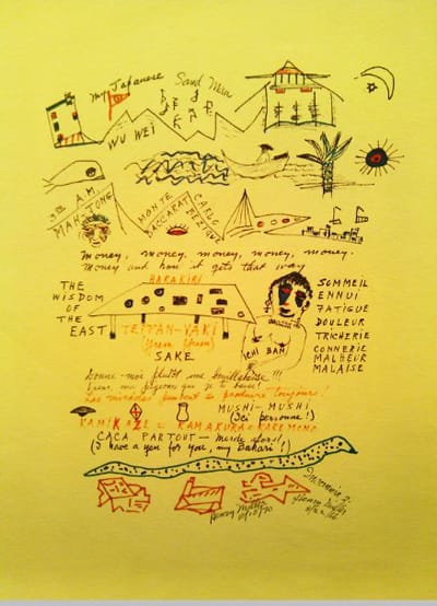 There are some good examples of poetry and image work together in a sort of respectful, tasteful way. One of those is a 1967 collaboration between poet Robert Creeley and artist R. B. Kitaj, called “Silkscreen Portfolio,” which represents what might be called the classic combination of a poet’s words and an artist’s gestures. The juncture of Philip Guston’s drawing and Bill Berkeson’s words in “Negative,” from 1973, results in a tie, with neither work adding nor detracting much from the other. For me, the work that truly took me by surprise and fulfilled curator Kyle Schlesinger’s idea of the “third element” was a set of lithographs by Henry Miller — yes, that Henry Miller, the tropical master of the C-word. The loopy psychedelic-era title of the boxed offset prints, “Insomnia of the Devil at Large,” led the eye to a set of lithographs and ink drawings which combined figures, places from his travels and collections of words in different languages which were some of the loveliest objects I’ve seen in a while.