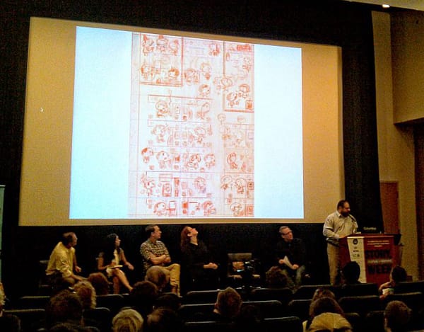 Brunetti talked at a gallop, entertaining the audience with anecdotes about his life (he arrived in the USA from Italy when he was eight, speaking no English), and taking us through the stages of making a New Yorker cover. It was no surprise to learn that he draws dozens of preparatory sketches in pencil, only working up to a final pen and ink drawing after a back and forth with the magazine’s cartoon editor. But I didn’t expect to hear that the final colors are added in Photoshop, because according to Brunetti “it would just take took long by hand.” He also talked about an exercise that he gives his cartooning students each year, in which he asks them to tell as much as they can about a famous work of literature in as few words and lines as possible. His own example was “The Catcher in the Rye,” reduced to a street-sign minimalist version of Holden Caulfield, a few background characters and the single word: “Phonies!”