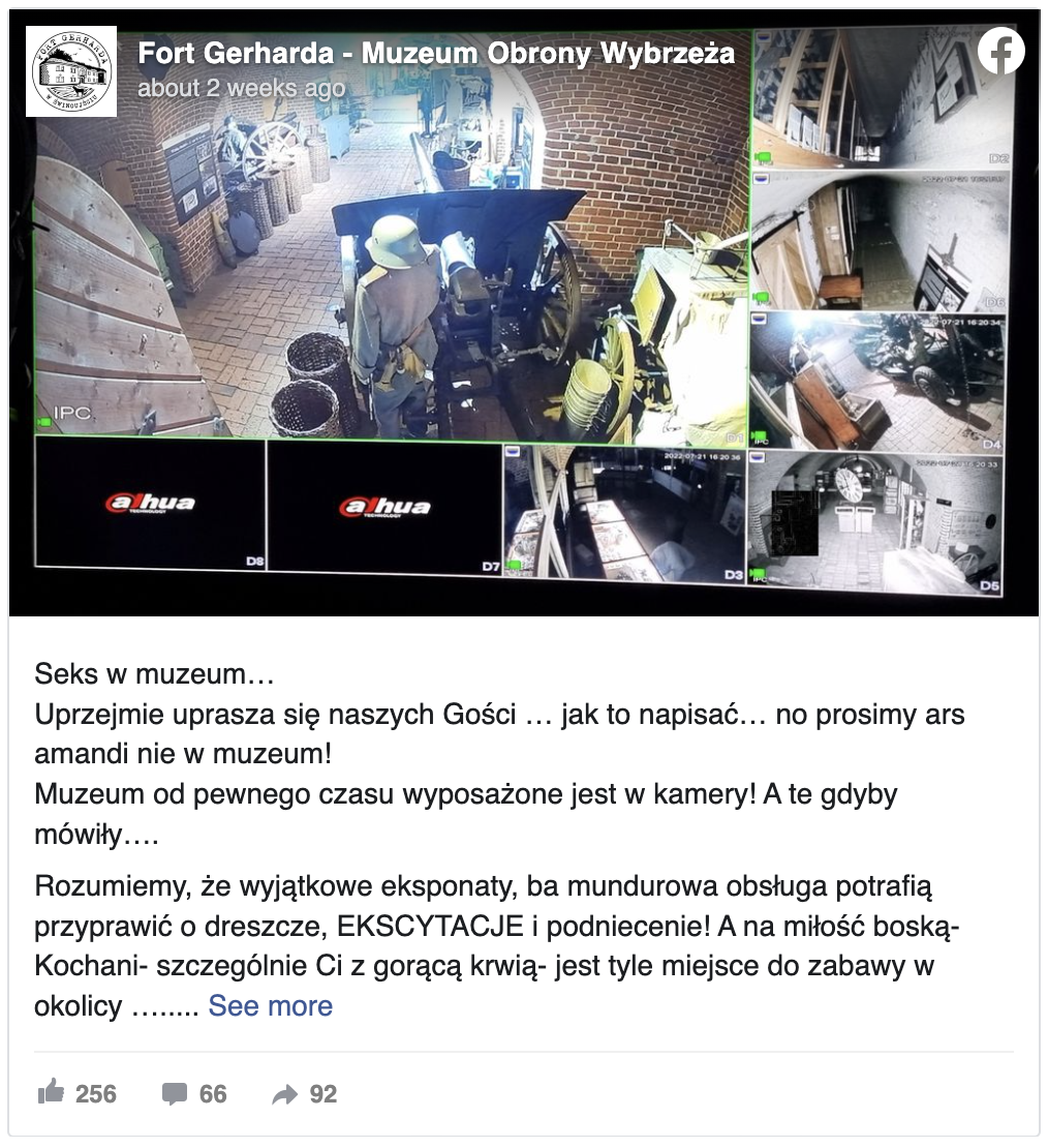 Such is the case with one Polish museum that is asking attendees to cease all sexual activities on its premises. The historic Fort Gerhard, now known as the Eastern Fort Museum on Wolin Island, recently issued a public statement requesting that “amorous” visitors refrain from defiling its grounds. In a Facebook post from July 21, originally written in Polish, museum representatives noted that new CCTV cameras caught three couples in the act since installing them.