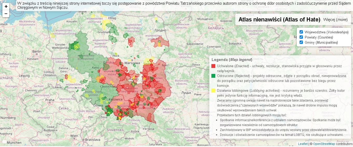 Launched in November of 2019, the Atlas of Hate features an interactive map that outlines Polish regions that have adopted the “anti-LGBT declaration,” others that have rejected it, and regions where extremist lobbying activities are being conducted to adopt the declaration. In addition, the project includes a spreadsheet in which individuals from other countries can see if their city or province has a partnership with a Polish “LGBT-free zone.”