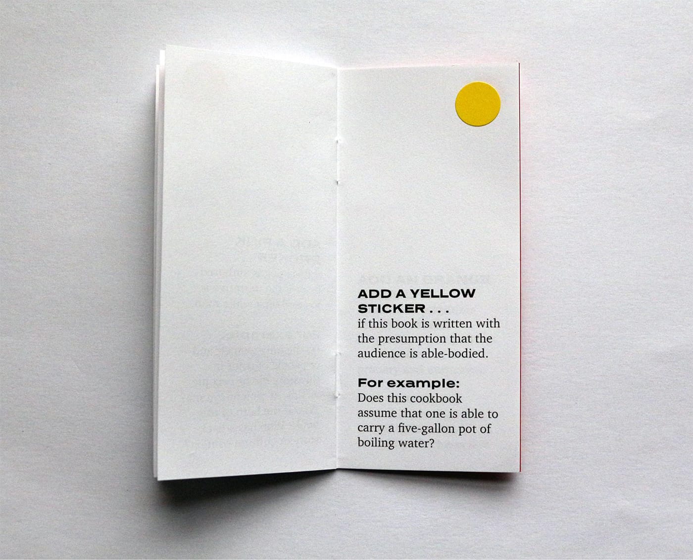 Related Tactics worked with visitors to the book sale, using a series of codified stickers to “make visible the ways unconscious biases and gaps in knowledge become normalized and often invisible.” Participants were supplied with circular sticky labels in different colors and were exhorted to use these stickers to categorize the book collection, based on considerations of race, perspective, and privilege. For instance, the addition of a red sticker indicates if a book is written about a particular culture, people, and/or place — but presumes a readership not of that culture, people, and/or place (this may include histories, artistic forms, travel, cooking, and romance).